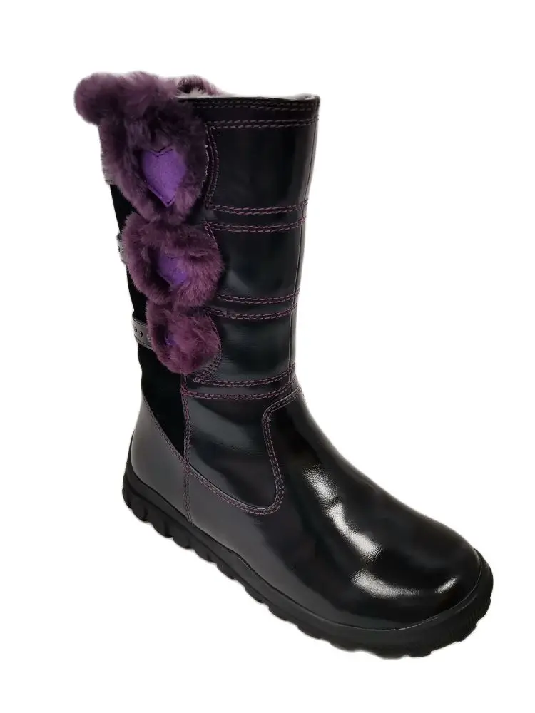 Ботинки для девочки из натуральной кожи. Цвет черный. Обработка кожи гладкая, в сочетании с нубуковой кожей. Молния позволяет быстро одеть и снять обувь. Внутри натуральный мех. Анатомическая подошва специально создана для предотвращения плоскостопия ребенка. Ребристая форма подошвы предотвращает скольжение и падение ребенка. Стойкие красители и высококачественные аксессуары позволяют долго сохранять хороший внешний вид обуви.
