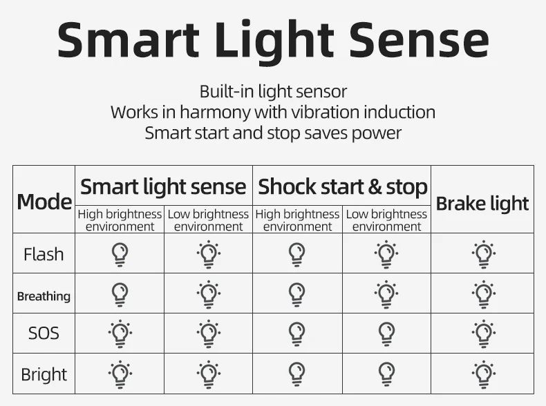 COB светодиодный. 1. Полностью 6061 шасси из алюминиевого сплава. 2. Автоматическое включение/выключение в зависимости от интенсивности и движения светильник. 3. Автоматическое переключение в режим сна для экономии энергии. 4. Крепление рельса сиденья 5,4 режима вспышки. 6,20 часов + время работы. Литий-ионная перезаряжаемая батарея емкостью 7,400 мАч. 8.USB зарядка. 9. Индикатор заряда батареи (мигает каждые 6 секунд) 10. Компактный и легкий дизайн (55 г). 11. Водонепроницаемость IPx6.