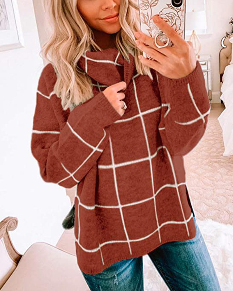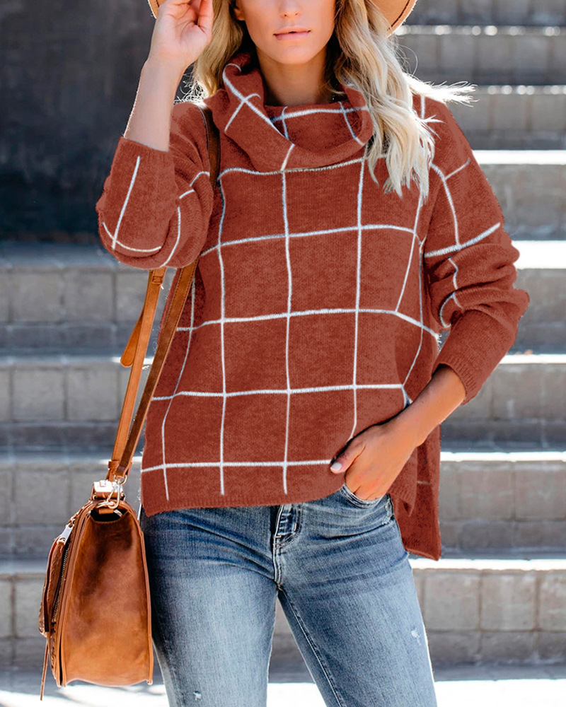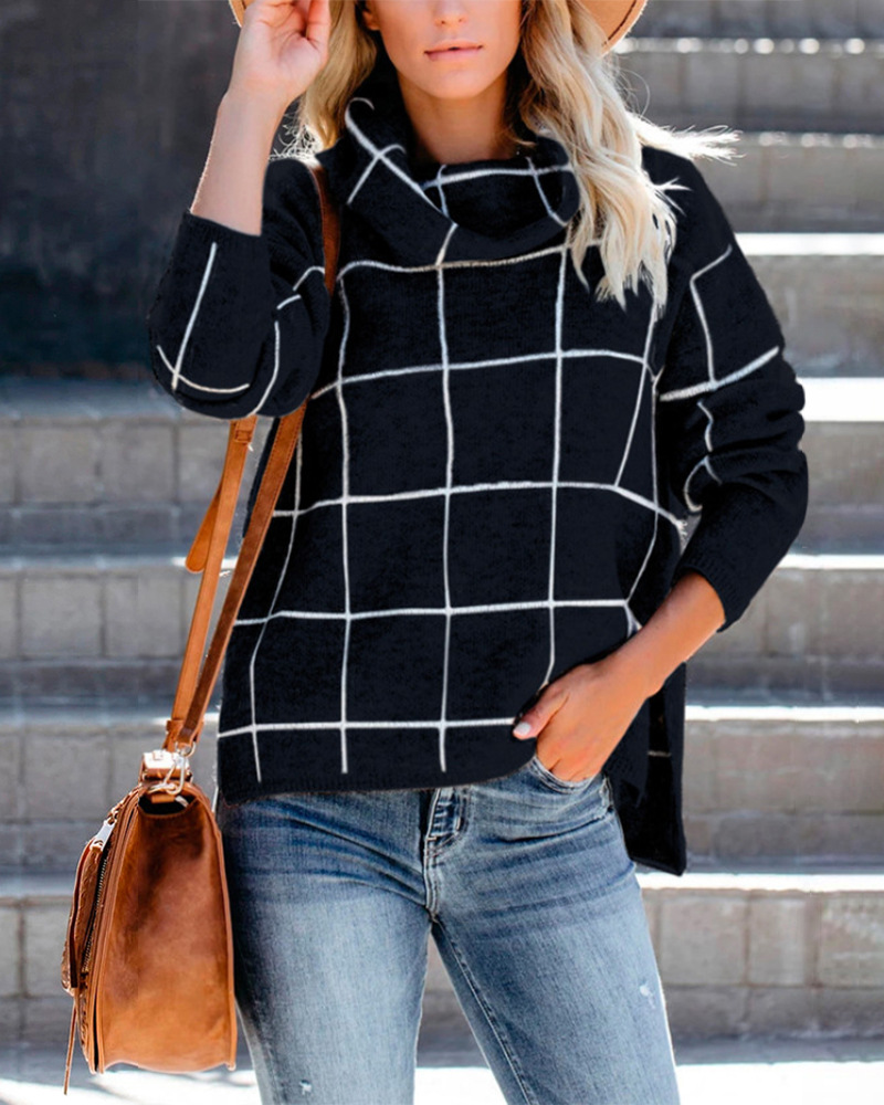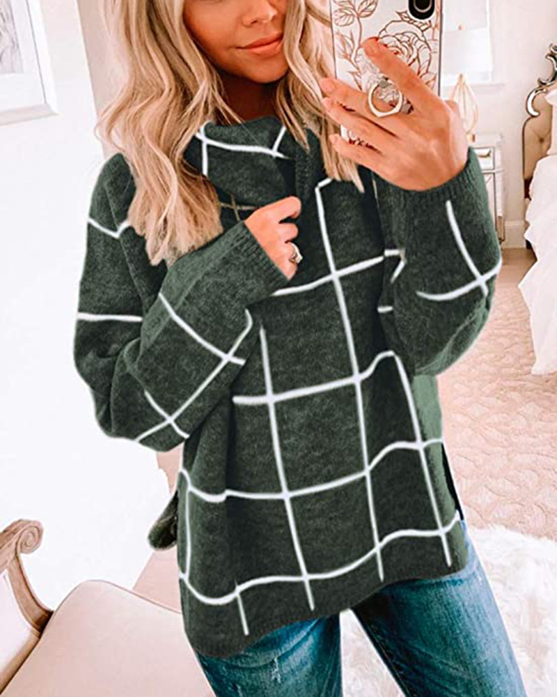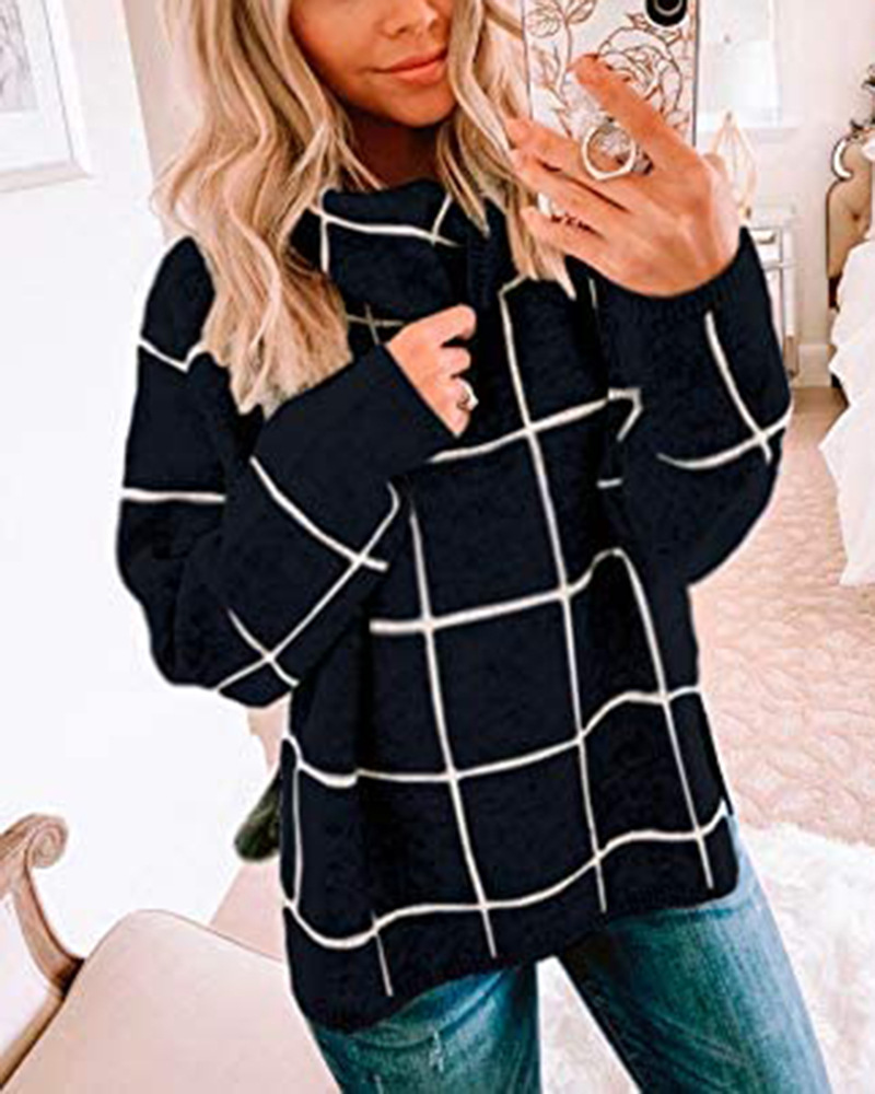 Женский пуловер, свитер с высоким воротом, в клетку, с длинным рукавом, свободный, Повседневный, в клетку, вязаный, зимний свитер, джемпер, топы