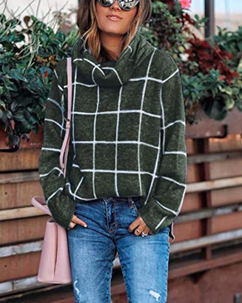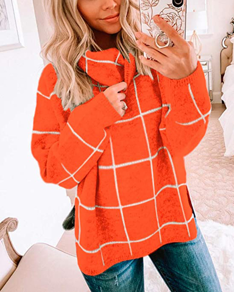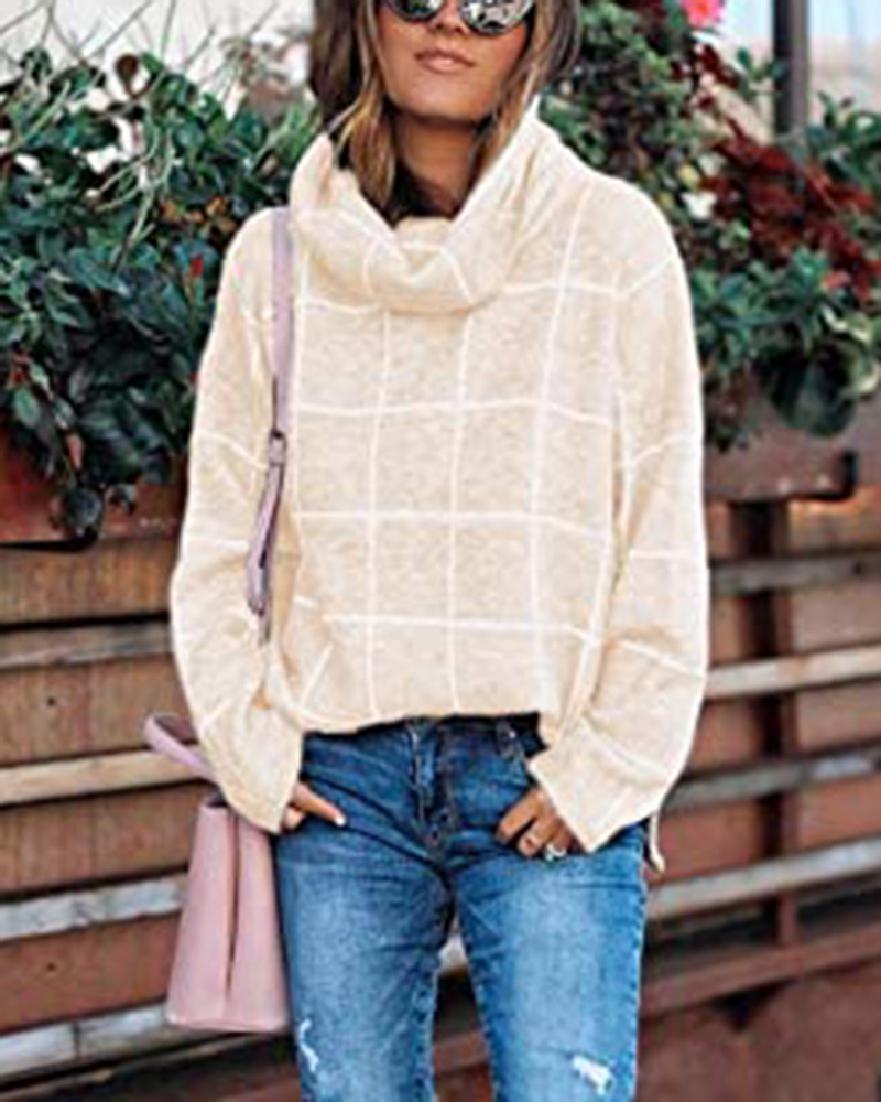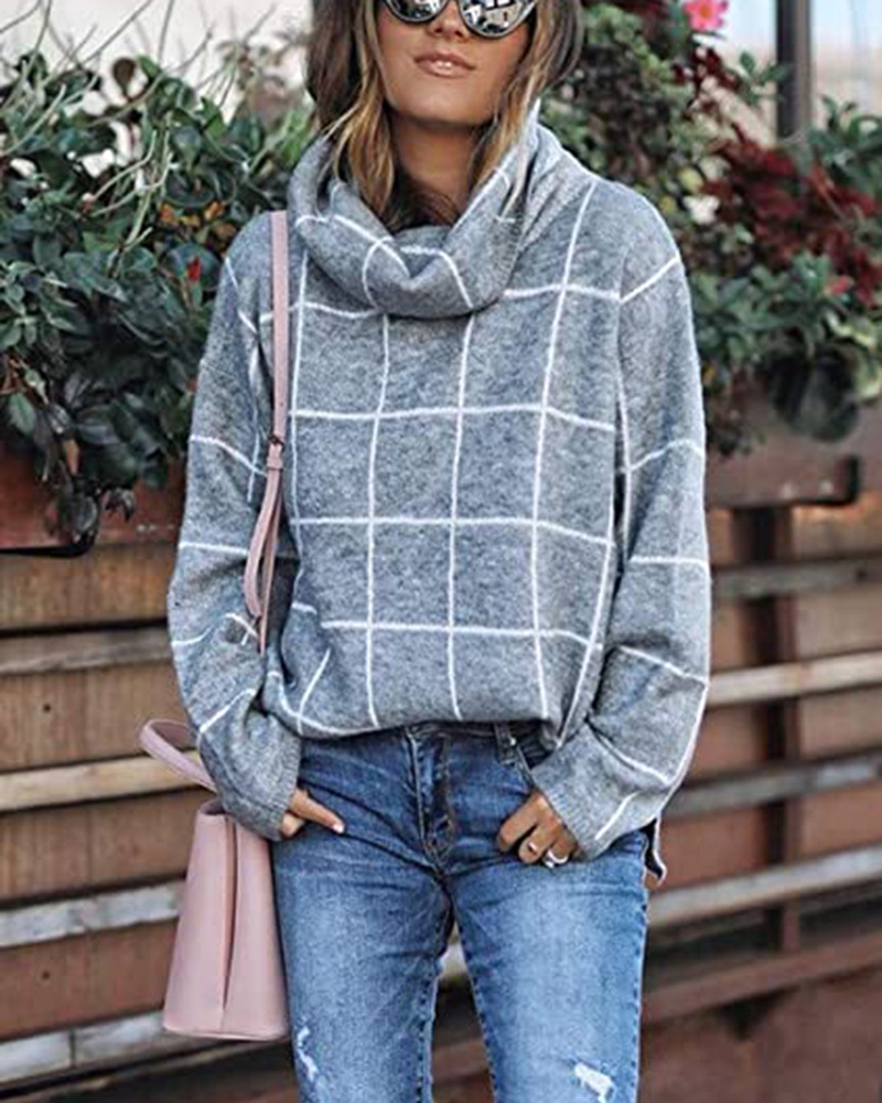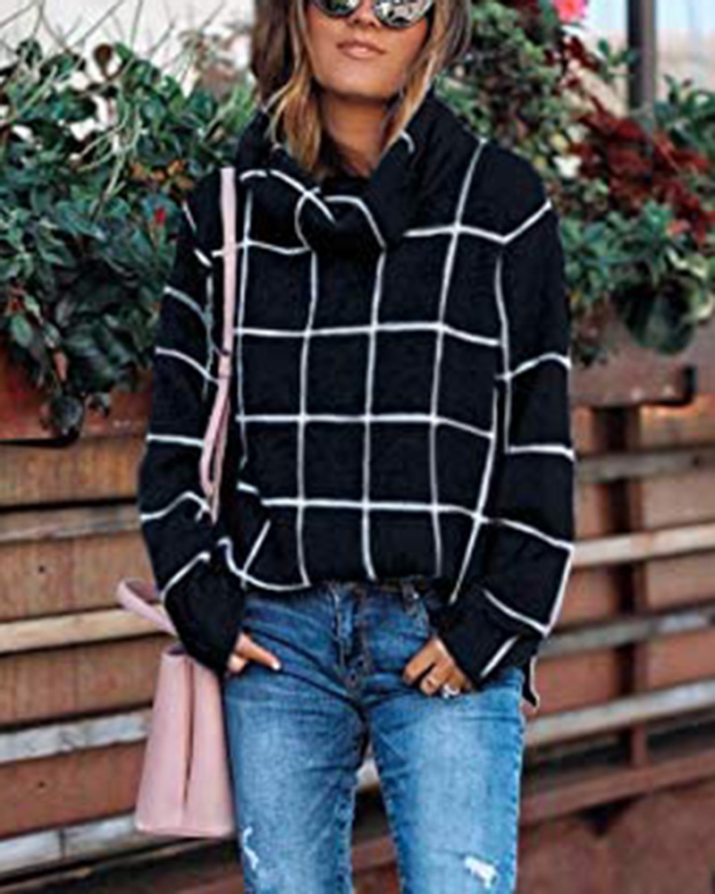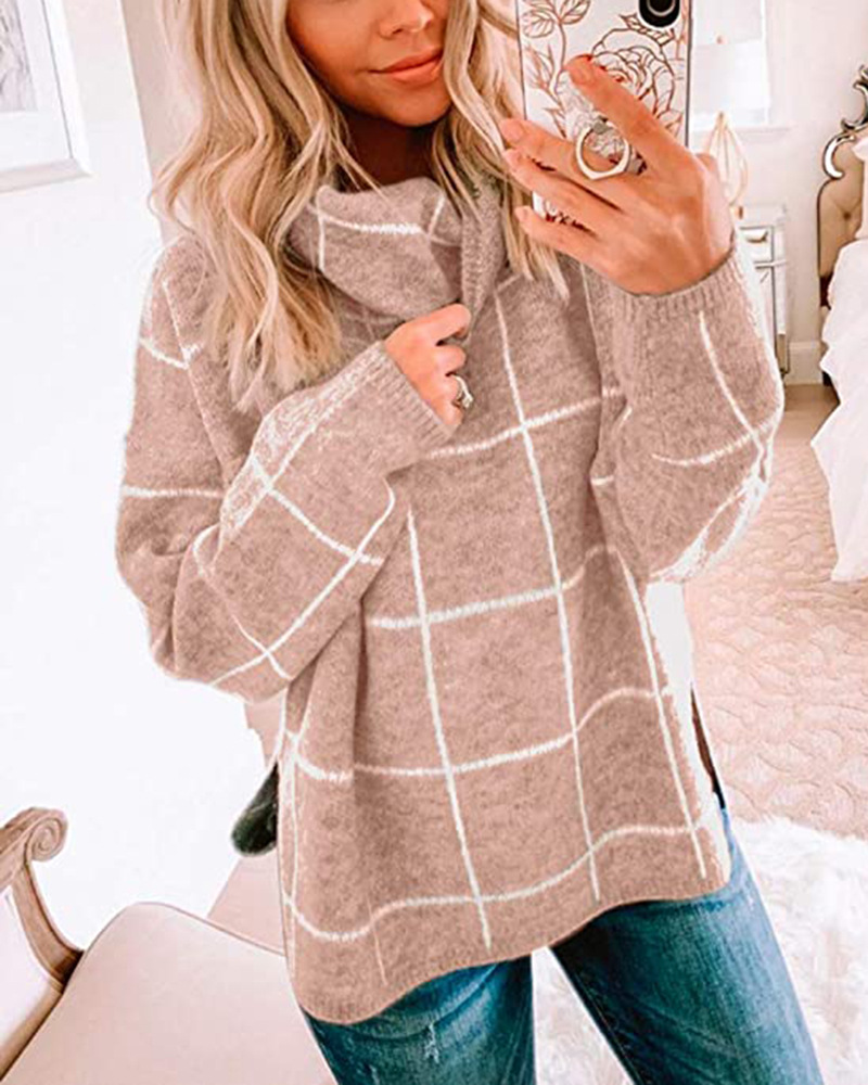 Женский пуловер, свитер с высоким воротом, в клетку, с длинным рукавом, свободный, Повседневный, в клетку, вязаный, зимний свитер, джемпер, топы