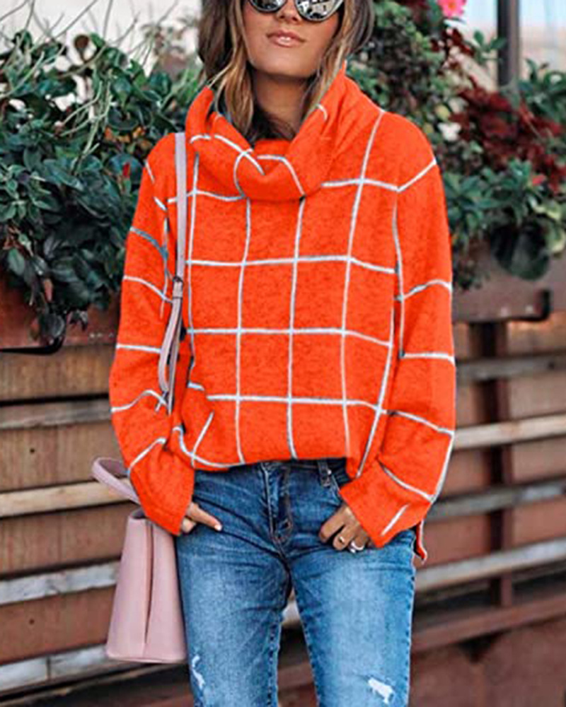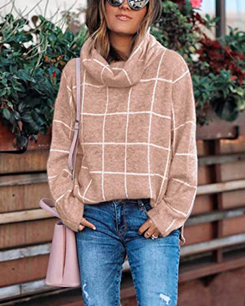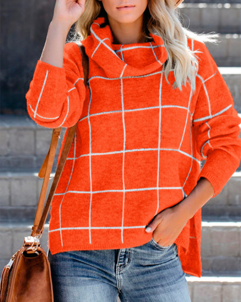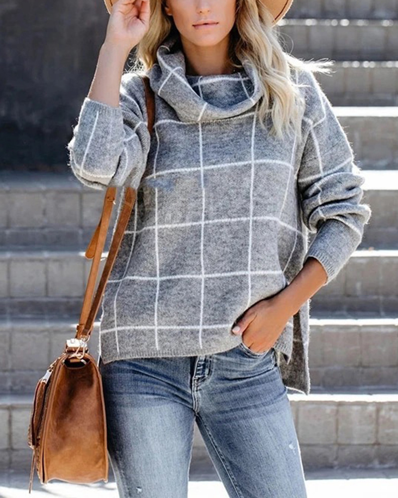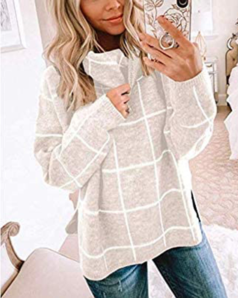 Женский пуловер, свитер с высоким воротом, в клетку, с длинным рукавом, свободный, Повседневный, в клетку, вязаный, зимний свитер, джемпер, топы