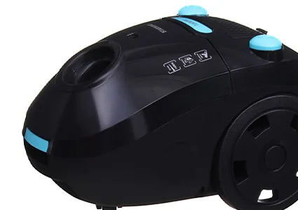 Пылесос выполнен из чёрного ударопрочного пластика с элементами декора голубого цвета. На дне расположены два больших основных колеса и 1 небольшое колесико – позволяющее с лёгкостью передвигать пылесос по комнате во время уборки в любом направлении.