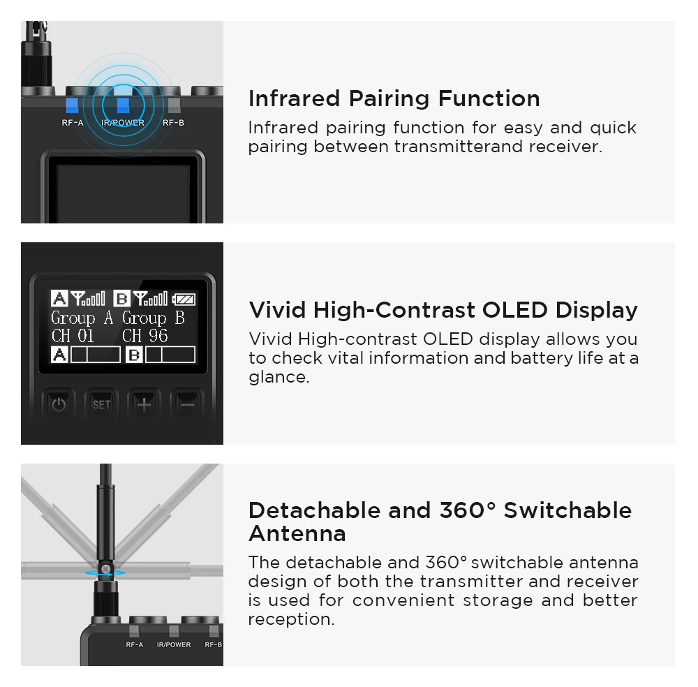Беспроводной приемник Saramonic UwMic9S RX-это монтируемый Двухканальный UHF приемник с широким переключением частот RF, высококонтрастным oled-дисплеем и инфракрасной синхронизацией между передатчиком и приемником. Две съемные антенны можно поворачивать на 360 ° для лучшего приема. Выход приемника может быть переключен между моно и стерео режимами. Функция с низким вырезом на приемнике минимизирует низкочастотный шум
