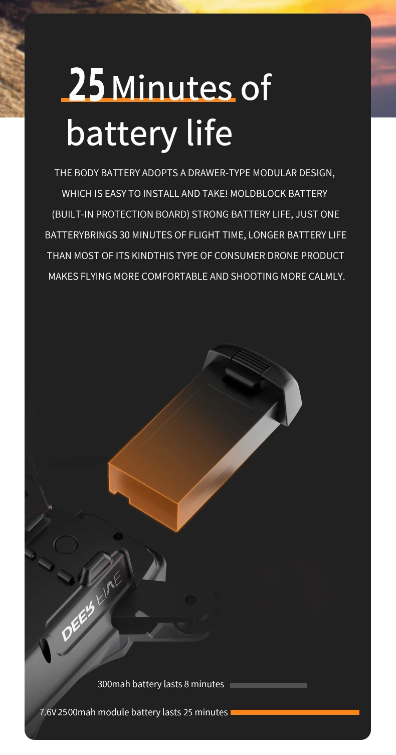 • Аккумулятор дрона: 7,6 V 2500 мА · ч (входит в комплект)