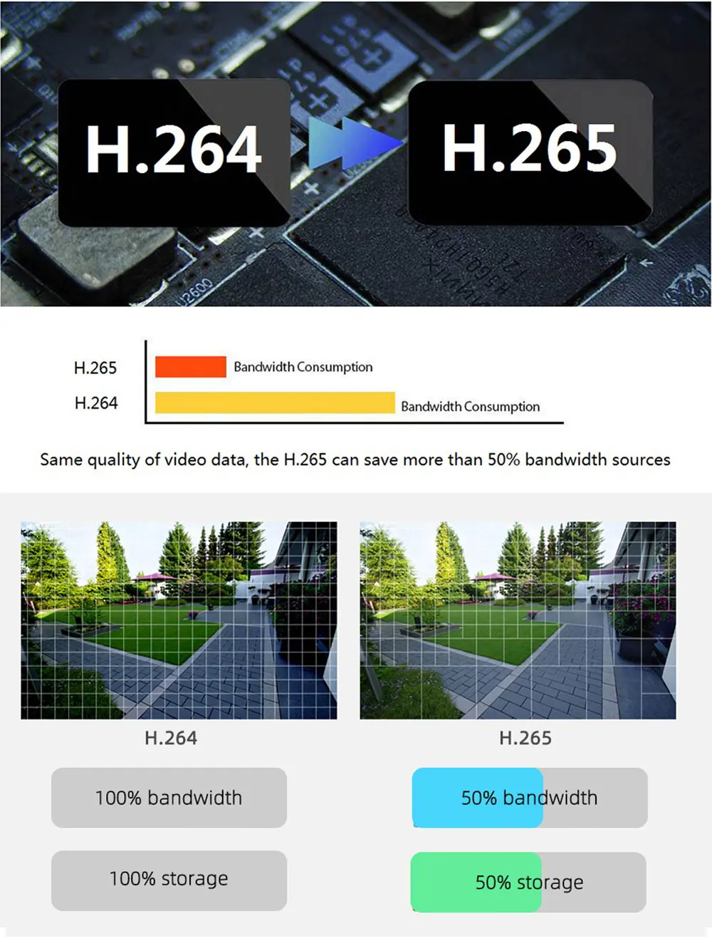 H.265 (HEVC) удваивает эффективность кодирования по сравнению с его предыдущей H.264. Это означает, что он экономит больше места для хранения, хранит больше видео и качество видео более плавное.