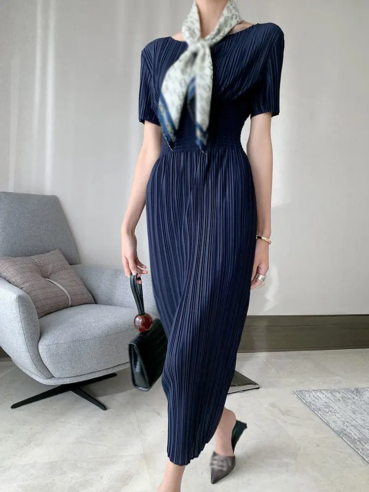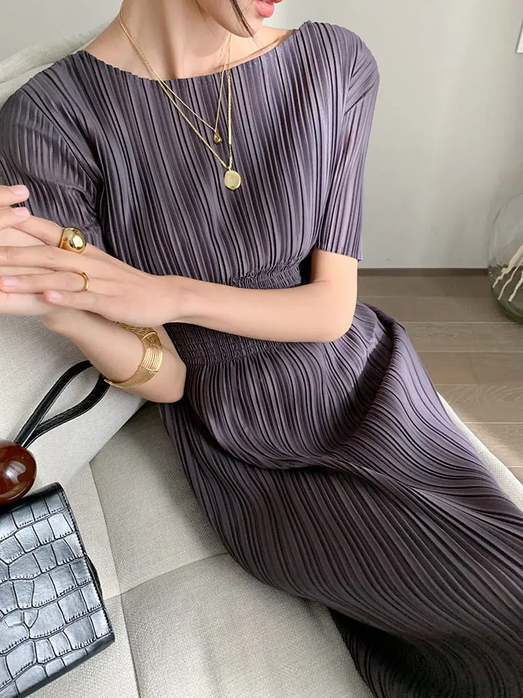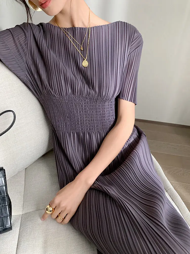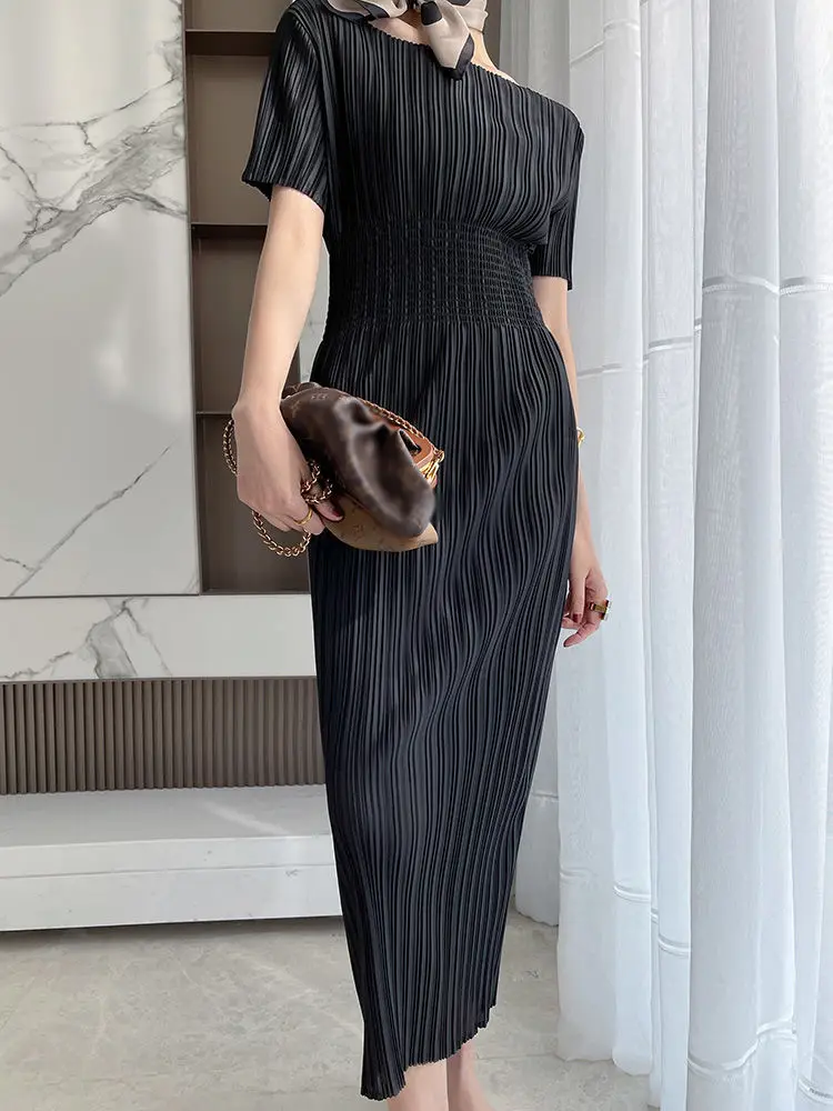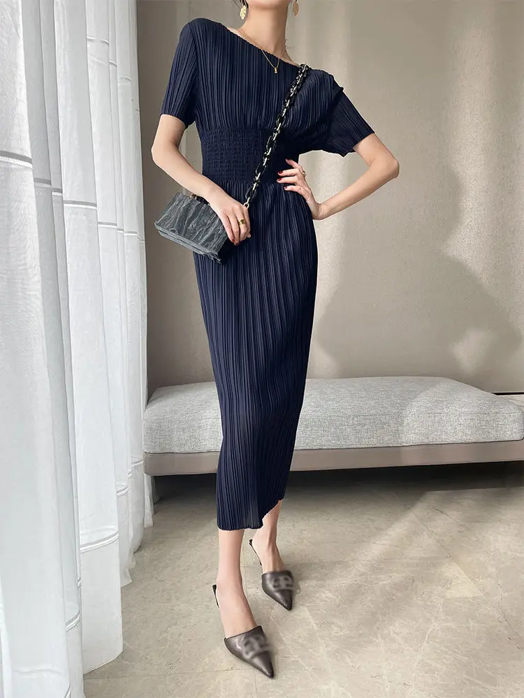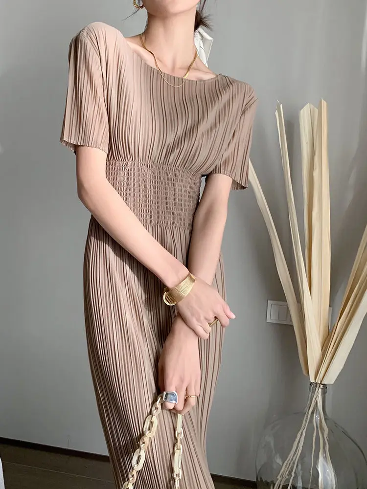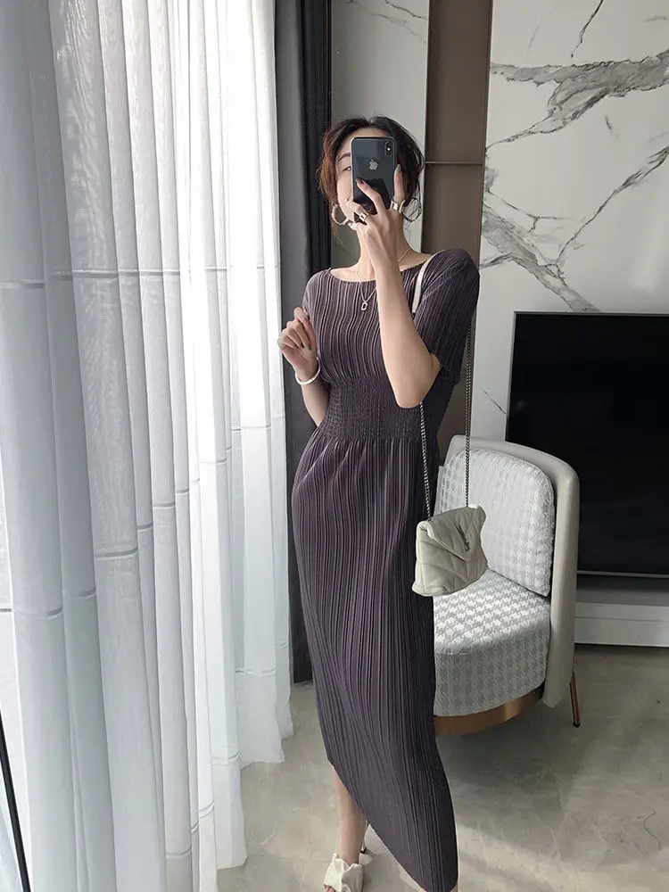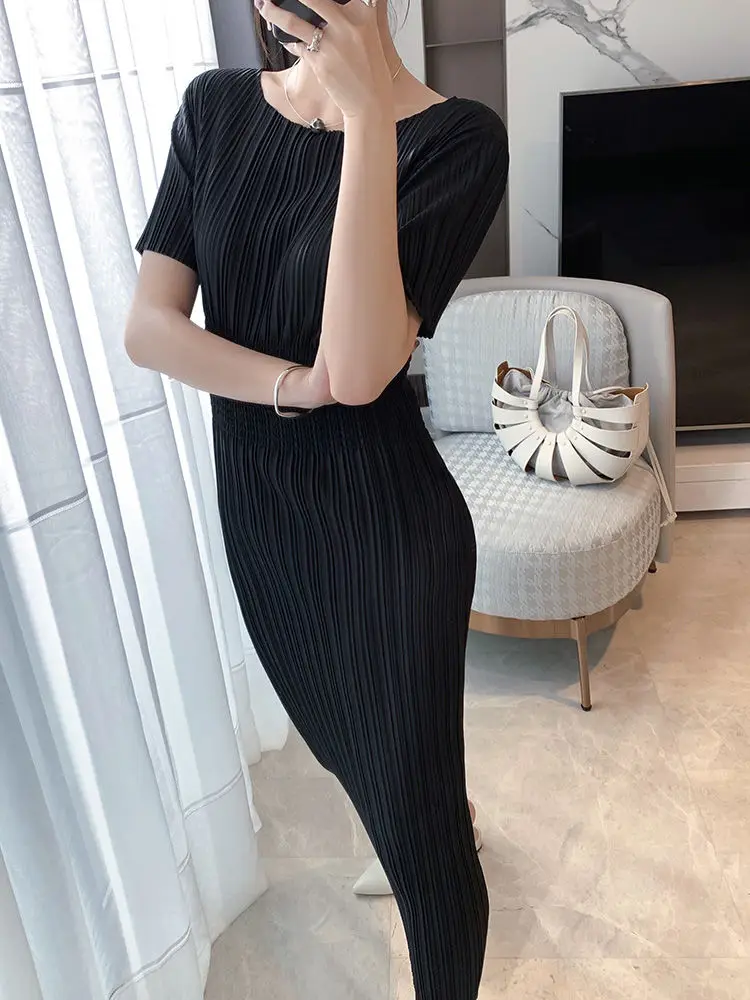 2021 Miyak плиссированное платье средней длины с высокой талией, женское однотонное платье с коротким рукавом и круглым вырезом, модные женские вечерние платья Badycon