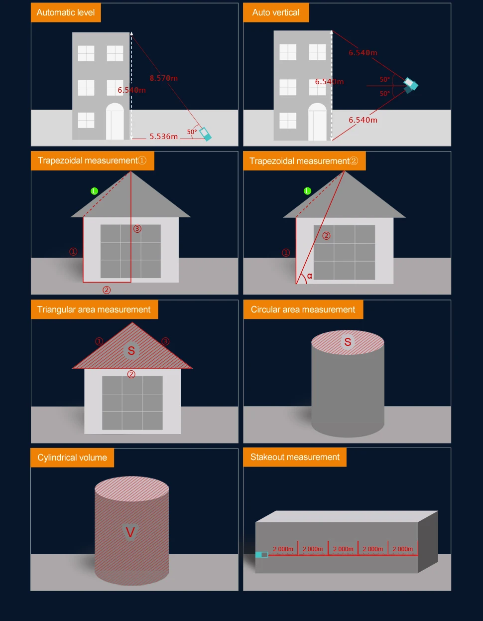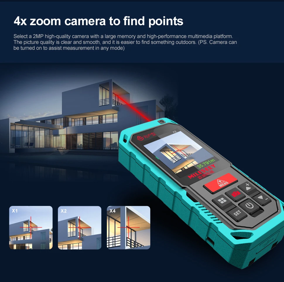 Наружный, Дальний диапазон 200 метров, 4-кратная зум-камера для поиска некоторых, экспорт CAD- key, хранение данных 1000 групп, степень защиты IP65, 15 измерительных функций, самораспознавание экрана должно перевернуть цветной экран, Двойной источник питания USB, экспорт данных USB на компьютер, цветной экран IPS HD