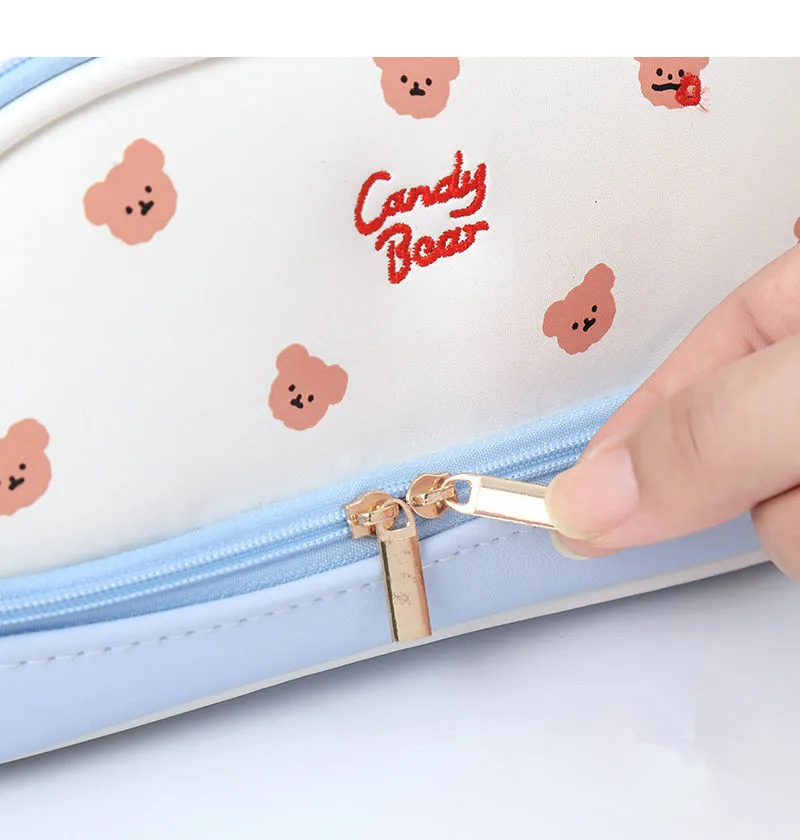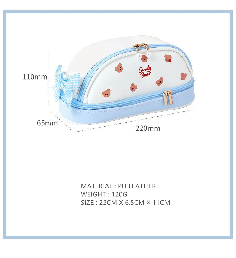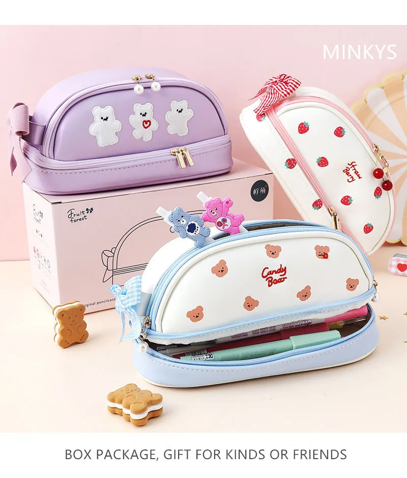 Чехол-карандаш MINKYS Kawaii с большой емкостью из искусственной кожи с изображением вишневого медведя, двухслойный чехол-ручка, сумка для хранения, школьные канцелярские принадлежности