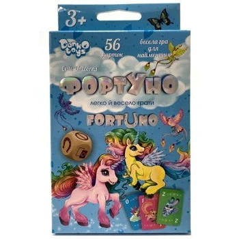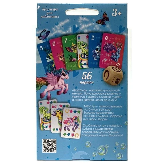 "ФортУно" - настольная игра для самых маленьких. Она поможет развить внимательность и скорость реакции у детей, а так же выучить числа от 0 до 9! Цель игры - как можно скорее избавиться от всех карт. Важно учитывать схожесть цветов, изображенных цифр и животных. Особенностью игры является наличие кубика с изображением дополнительных заданий для игроков и специальной карты "ФортУно"! В комплекте: игровые карточки - 56 штук; кубик; инструкция.