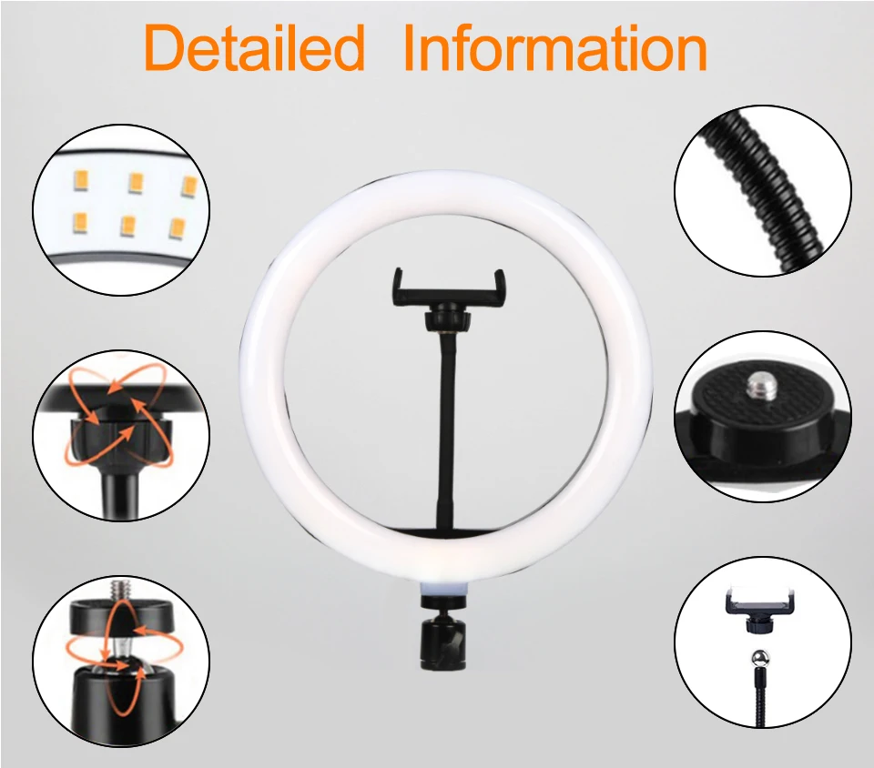 -10 способов регулировки света, теплый белый свет свободно регулируется с помощью телефонного зажима, вы обе руки специальный SMD СВЕТОДИОДНЫЙ дизайн, легкий и портативный. -- Постоянный ток привода, низкая потеря мощности. Отсутствие ультрафиолетовых лучей и инфракрасного излучения, низкое производство тепла, безопасность и окружающую среду. -Широко применяется для освещения наружной фотографии, освещения дома, портрета, моды, свадебного искусства, фотографии рекламы, видеосъемки, И т. Д.-с усиленной гибкой рукояткой, которая свободно двигается и никогда не опускается. -- Там будут блестящие кольца, чтобы обдумывать ваши глаза, когда вы носите очаровательные косметические контактные линзы.
