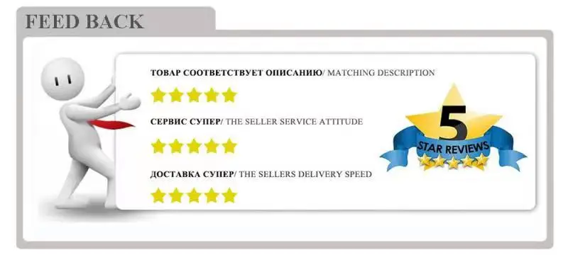 Мы поддерживаем высокие стандарты качества и стремимся к 100% удовлетворенности клиентов! Обратная связь очень важна, мы просим Вас связаться с нами, прежде чем оставить нейтральный или отрицательный отзыв, чтобы мы могли удовлетворительно решить ваши проблемы. Невозможно решить проблемы, если мы о них не знаем!