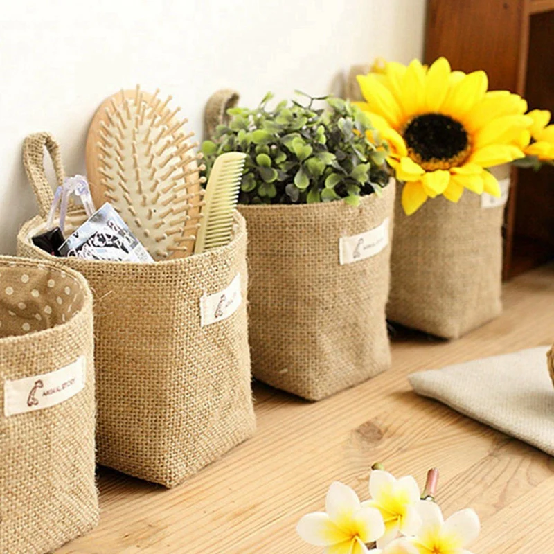 2 Pcs Cotton Linen Art Flower Pot Small Sack Hanging Jute Cotton Dot Storage Basket Storage Bag(Blue Point & Yellow Stripes)
