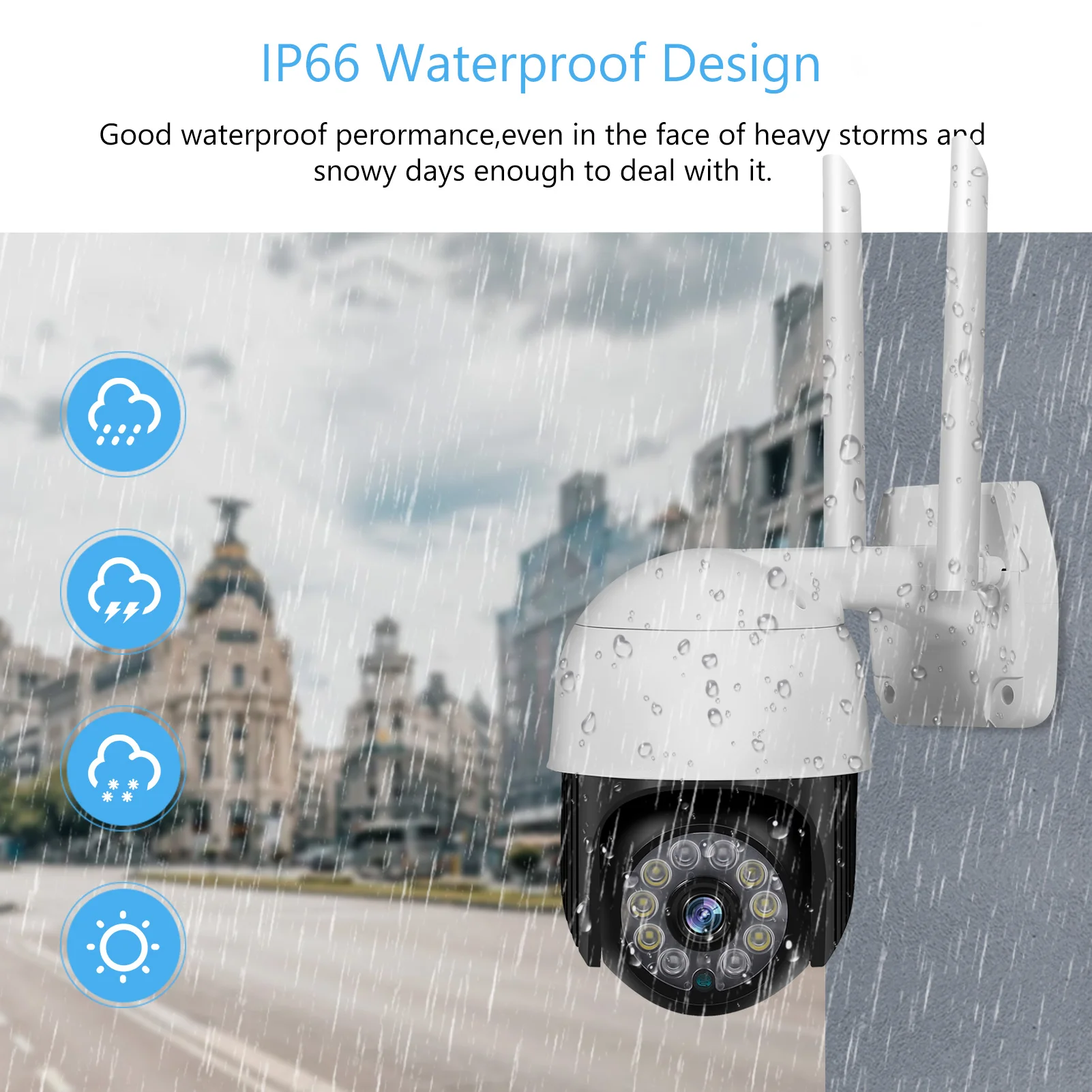 IP66 водонепроницаемый: Конструкция камеры безопасности с водонепроницаемым корпусом IP66, который может выдерживать экстремальные погодные условия, такие как дождь, снег, тепло. Отлично подходит для использования на улице и в помещении