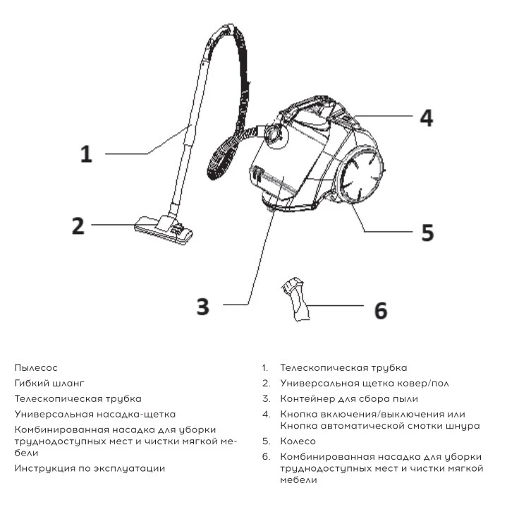 | Комплектация | Пылесос Контейнер для сбора пыли Телескопическая трубка Насадка для пола Щелевая насадка + мини-щетка Инструкция |