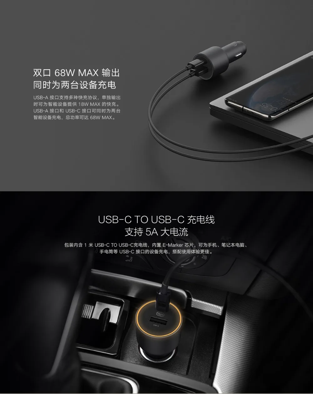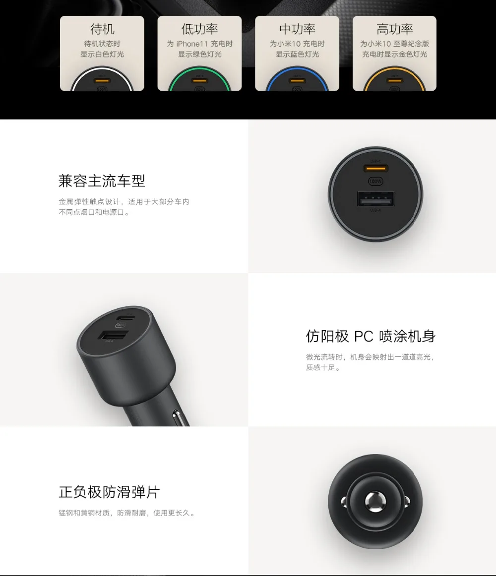 -Когда автомобильное зарядное устройство отдельно помещается с портом прикуривателя и портом питания, индикатор показывает белый цвет; Когда интерфейс USBC используется для зарядки смарт-устройства, индикатор показывает зеленый цвет в состоянии низкой зарядки, а индикатор показывает синий цвет в среднем состоянии зарядки.