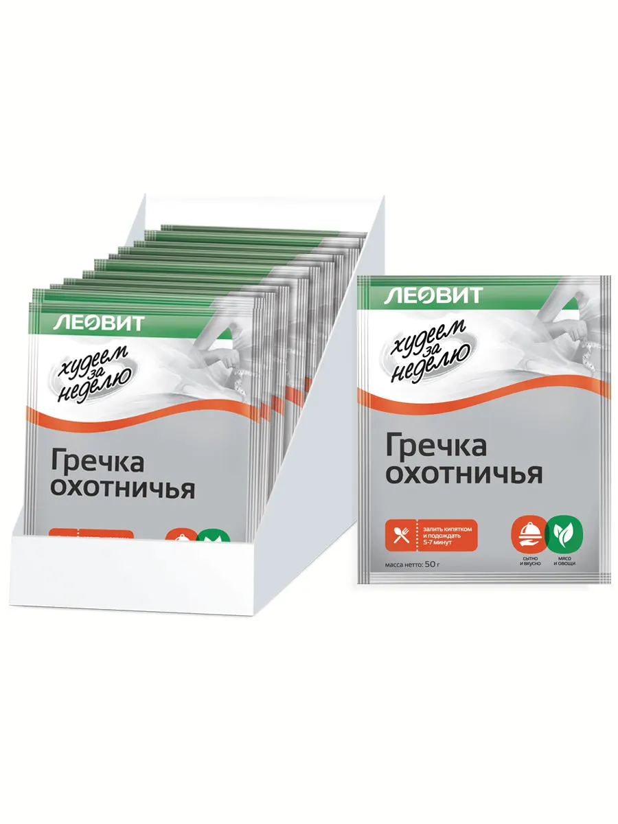 Популярнейше второе блюдо из наших кейсов "Худеем за неделю"! Сочетание мяса, овощей и гречневой крупы во втором блюде не только вкусно и питательно, но и оптимально с точки зрения действия на пищеварительную систему. Гречку охотничью готовят из мяса, гречки, овощей, зелени и пряностей. Получается вкусно и сытно, а кроме того, полезно - гречка богата макро- и микроэлементами, витаминами и клетчаткой, необходимыми организму. На то, чтобы создать такое блюдо, у вас уйдет не менее часа, но не в случае с нашим! Гречка охотничья приготовлена по классическому рецепту, при этом имеет свои особенности. В одной порции - всего 160 ккал. Ее достаточно залить кипятком, перемешать, дать настояться 5-7 минут. Блюдо готово!