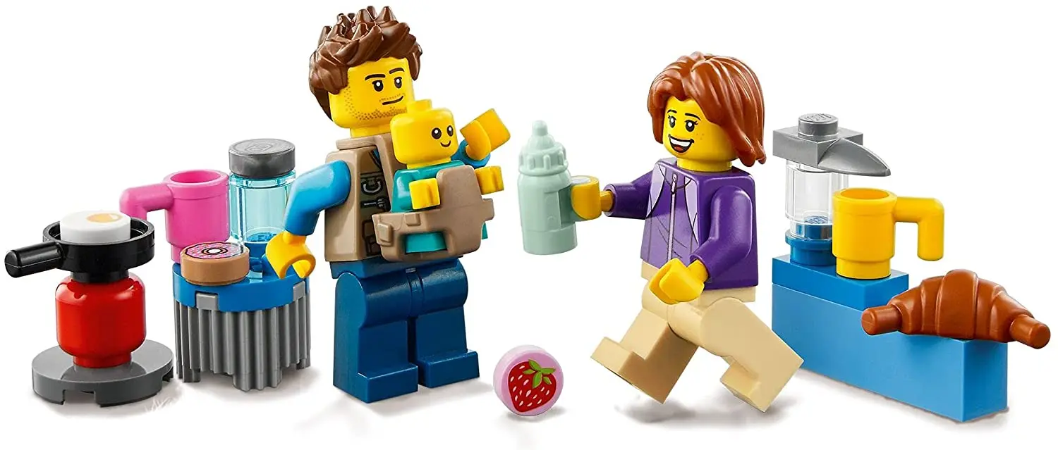 Аксессуары включают в себя крутую детскую переноску для мини-фигурок, печь для кемпинга с кастрюлей, а также жареное яйцо и круассан.