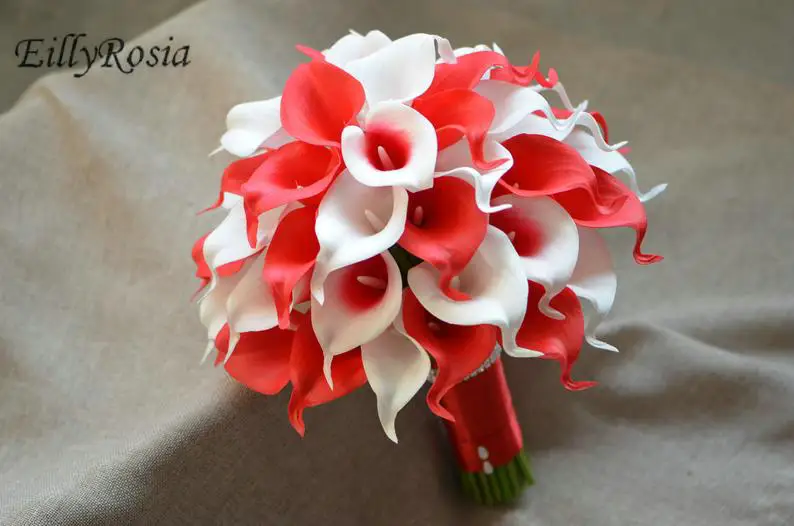 EillyRosia белый и красный смешанный цвет Свадебный букет настоящий прикосновение Cala Lily Свадебный букет подружки невесты держащие цветы искусственные
