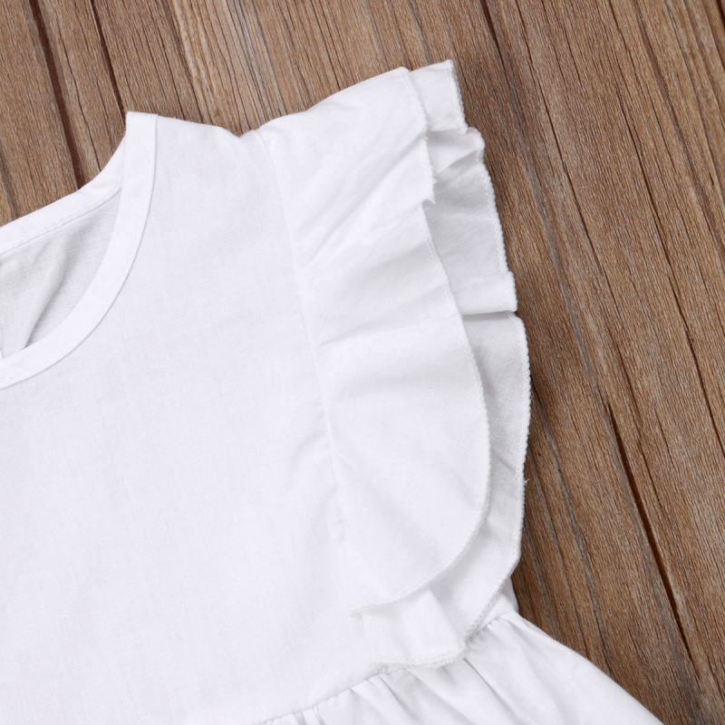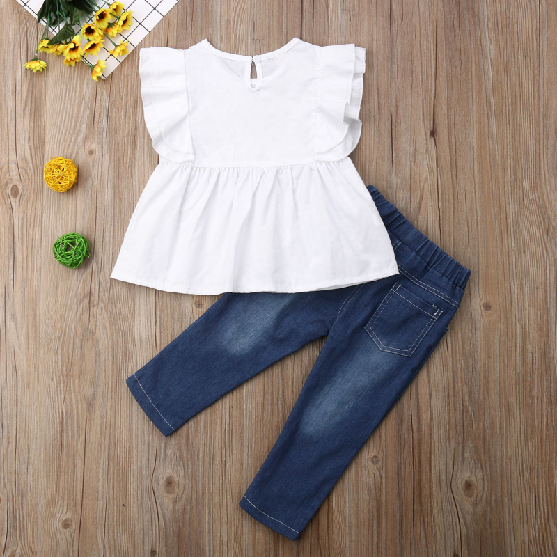 Новинка 2021 года, комплект одежды для маленьких девочек, белая футболка с рюшами, жилет синие джинсовые штаны, джинсовые штаны От 2 до 7 лет повседневная хлопковая одежда для малышей