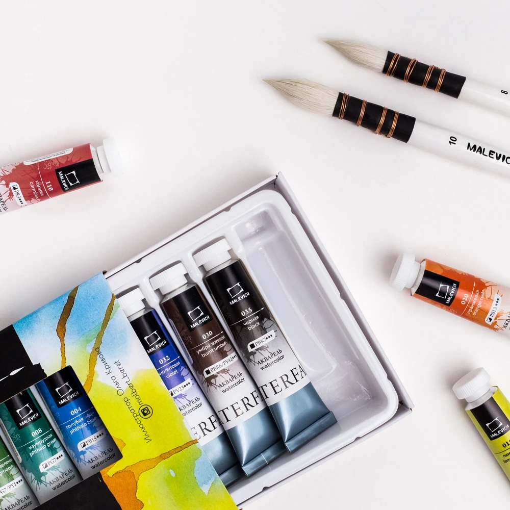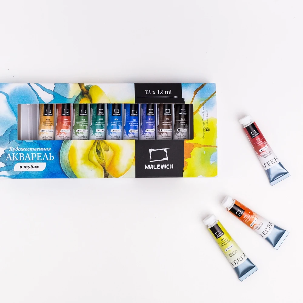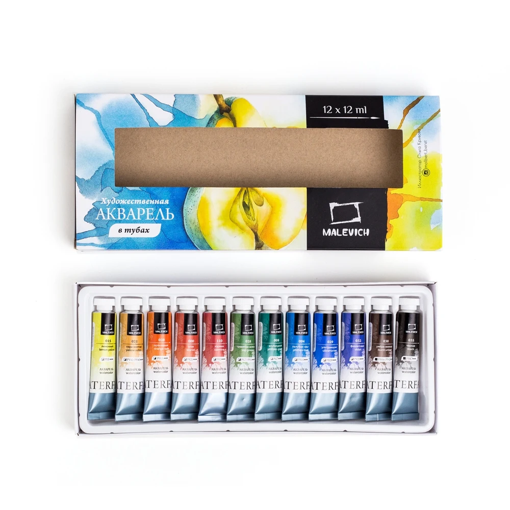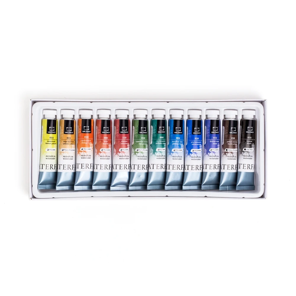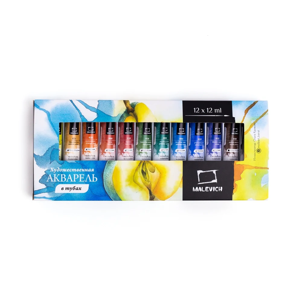 Акварель "Малевичъ" в тубах по 12 мл. Коллекция акварели "Малевичъ" разработана совместно с российскими художниками. В её состав входит натуральный гуммиарабик, который признан лучшим связующим для акварели. Яркие, насыщенные и светостойкие пигменты гарантируют отличную сохранность готовых работ.Состав: пигмент, гуммиарабик, каолин. При производстве акварели "Малевичъ" не используются кадмий и сырье животного происхождения (акварель подходит для веганов и вегетарианцев). Акварель относится к классу сухих и не содержит пластификаторов животного или химического происхождения. Не рекомендуется для разлива по кюветам. Для того, чтобы акварель максимально долго оставалась свежей и сохраняла насыщенность пигментов, храните ее в тюбиках, выдавливая на палитру количество, необходимое для работы. При необходимости использовать акварель в кюветах или герметичной палитре в краску можно добавить каплю меда. Лайфхак: остатки засохшей акварели можно использовать для создания интересных эффектов и фонов. Для этого растолките краску до состояния мелкой крошки, намочите акварельную бумагу и посыпьте крошками акварели разных цветов.Цвет краски может немного отличаться от цвета на этикетке и дисплее телефона или компьютера. При выборе красок рекомендуем обращать внимание на пигментный состав (он указан на этикетке). Состав набора: лимонный, желтая светлая, охра желтая, красная, алая, краплак розовый, травяная зеленая, изумрудная, голубая "фц", ультрамарин, умбра жженая, черная.