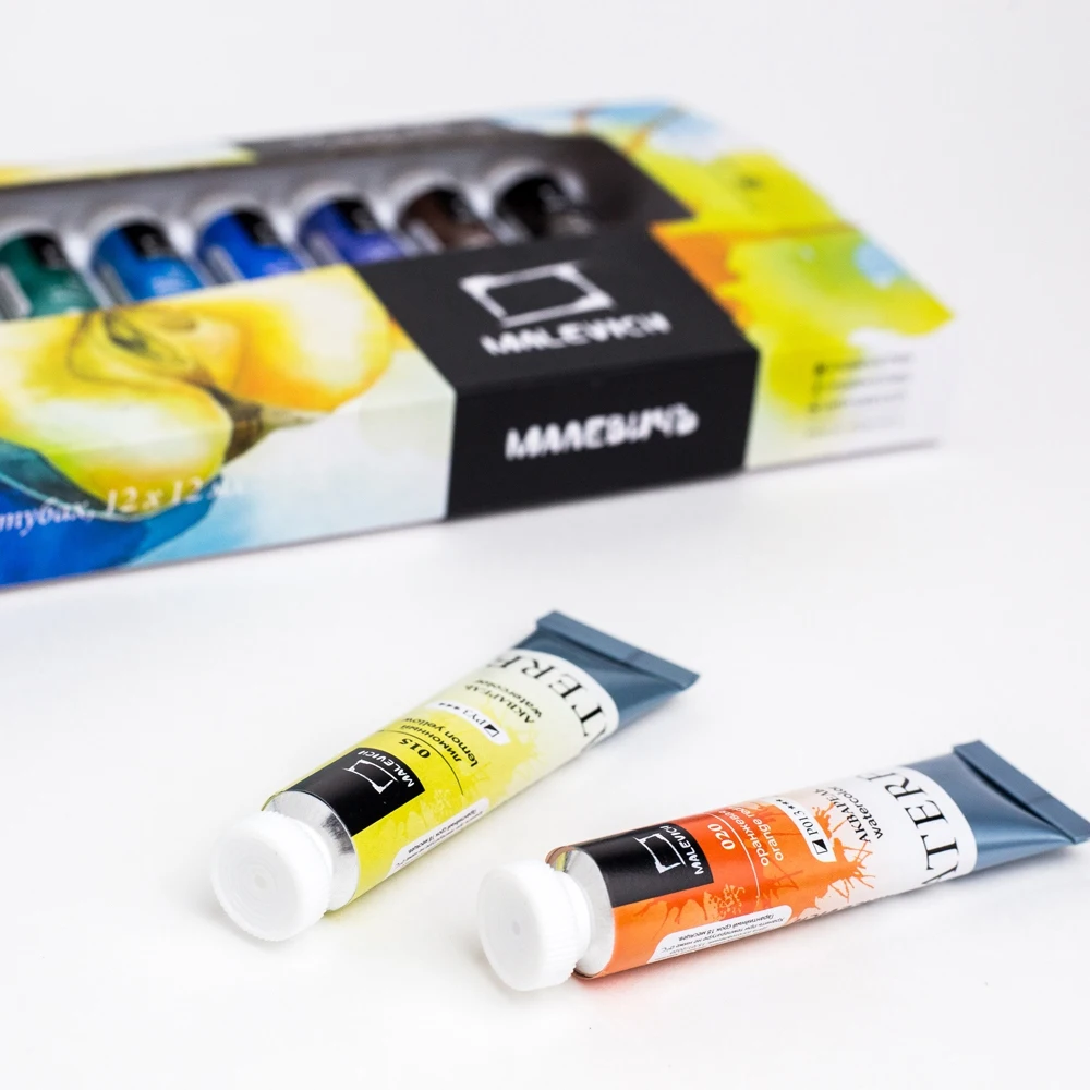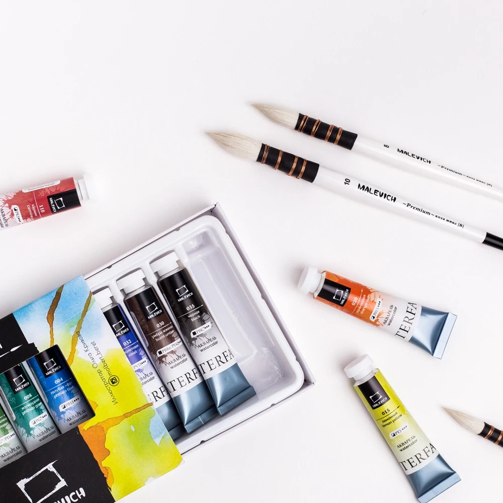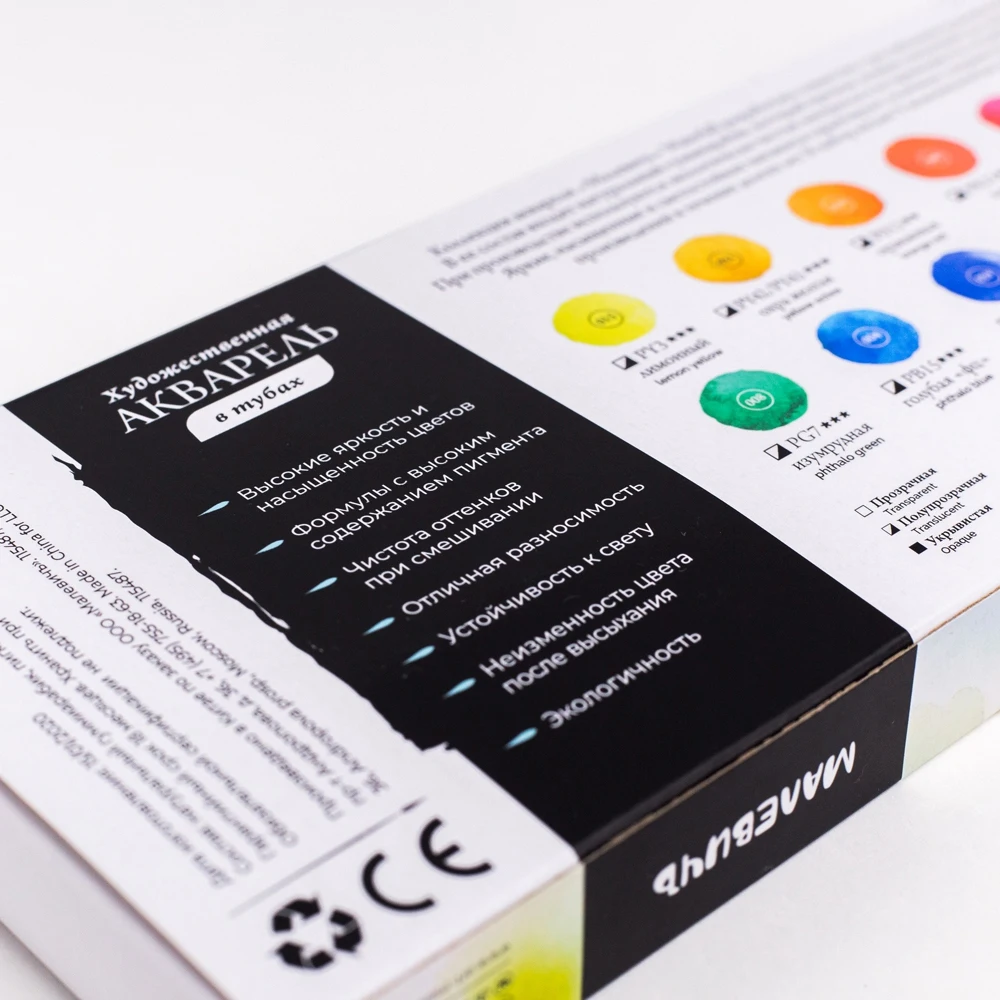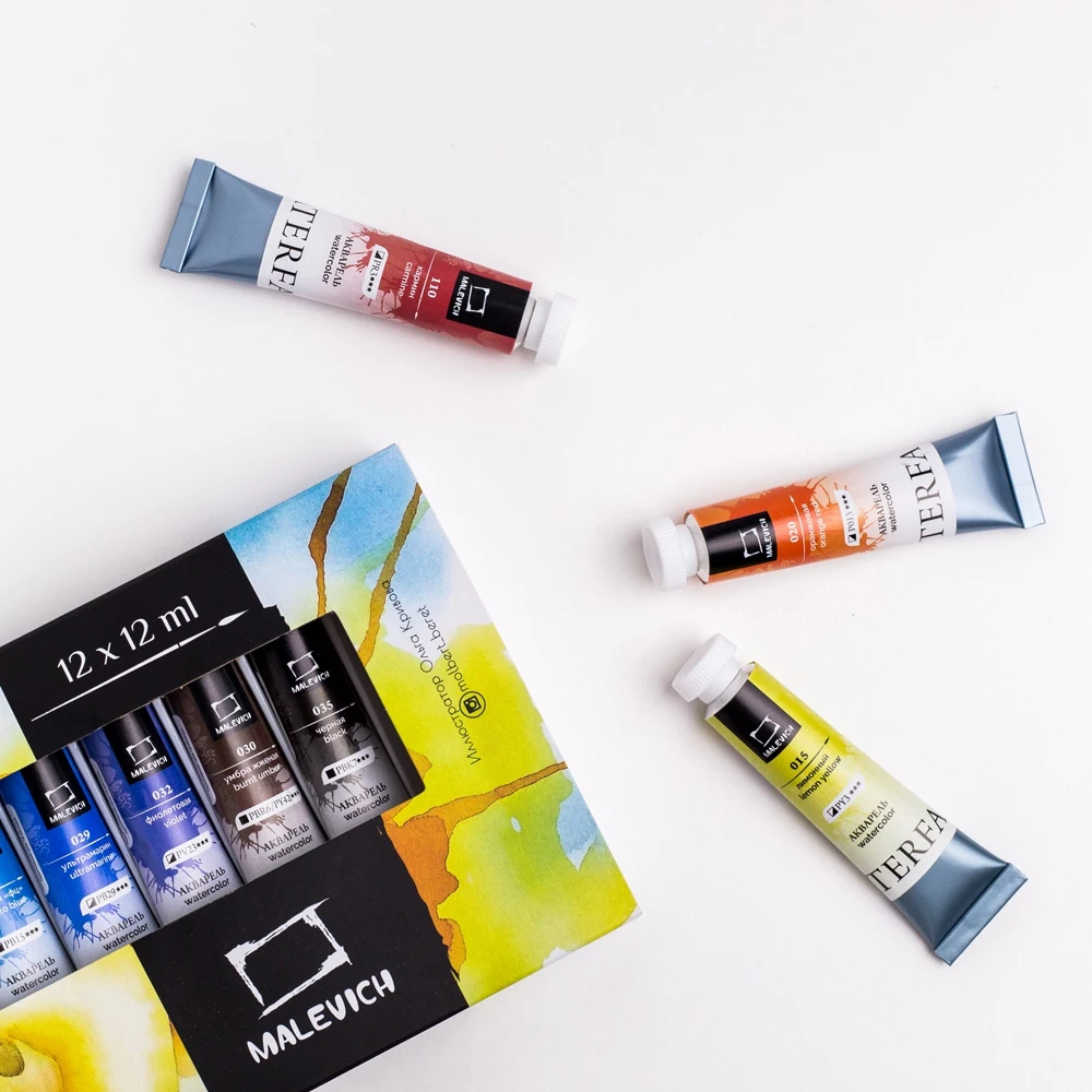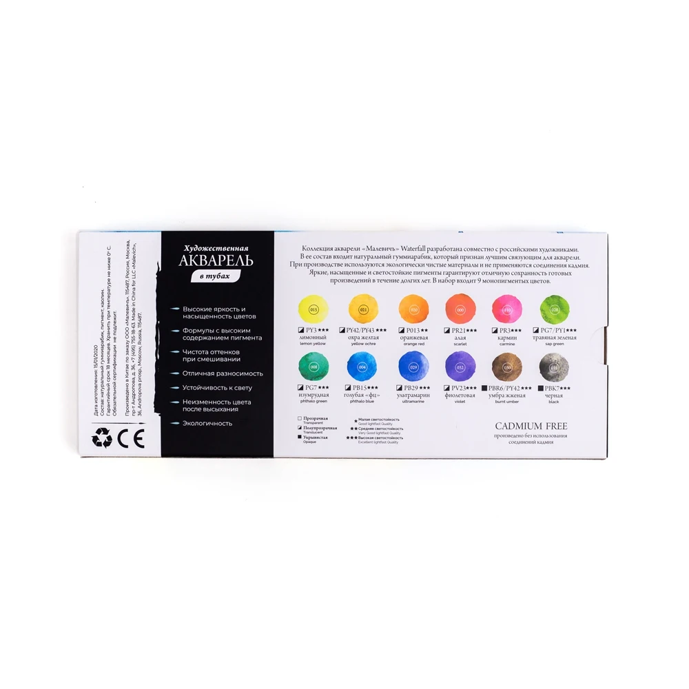 Акварель "Малевичъ" в тубах по 12 мл. Коллекция акварели "Малевичъ" разработана совместно с российскими художниками. В её состав входит натуральный гуммиарабик, который признан лучшим связующим для акварели. Яркие, насыщенные и светостойкие пигменты гарантируют отличную сохранность готовых работ.Состав: пигмент, гуммиарабик, каолин. При производстве акварели "Малевичъ" не используются кадмий и сырье животного происхождения (акварель подходит для веганов и вегетарианцев). Акварель относится к классу сухих и не содержит пластификаторов животного или химического происхождения. Не рекомендуется для разлива по кюветам. Для того, чтобы акварель максимально долго оставалась свежей и сохраняла насыщенность пигментов, храните ее в тюбиках, выдавливая на палитру количество, необходимое для работы. При необходимости использовать акварель в кюветах или герметичной палитре в краску можно добавить каплю меда. Лайфхак: остатки засохшей акварели можно использовать для создания интересных эффектов и фонов. Для этого растолките краску до состояния мелкой крошки, намочите акварельную бумагу и посыпьте крошками акварели разных цветов.Цвет краски может немного отличаться от цвета на этикетке и дисплее телефона или компьютера. При выборе красок рекомендуем обращать внимание на пигментный состав (он указан на этикетке). Состав набора: лимонный, желтая светлая, охра желтая, красная, алая, краплак розовый, травяная зеленая, изумрудная, голубая "фц", ультрамарин, умбра жженая, черная.