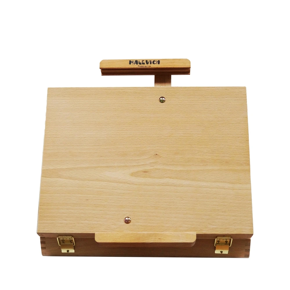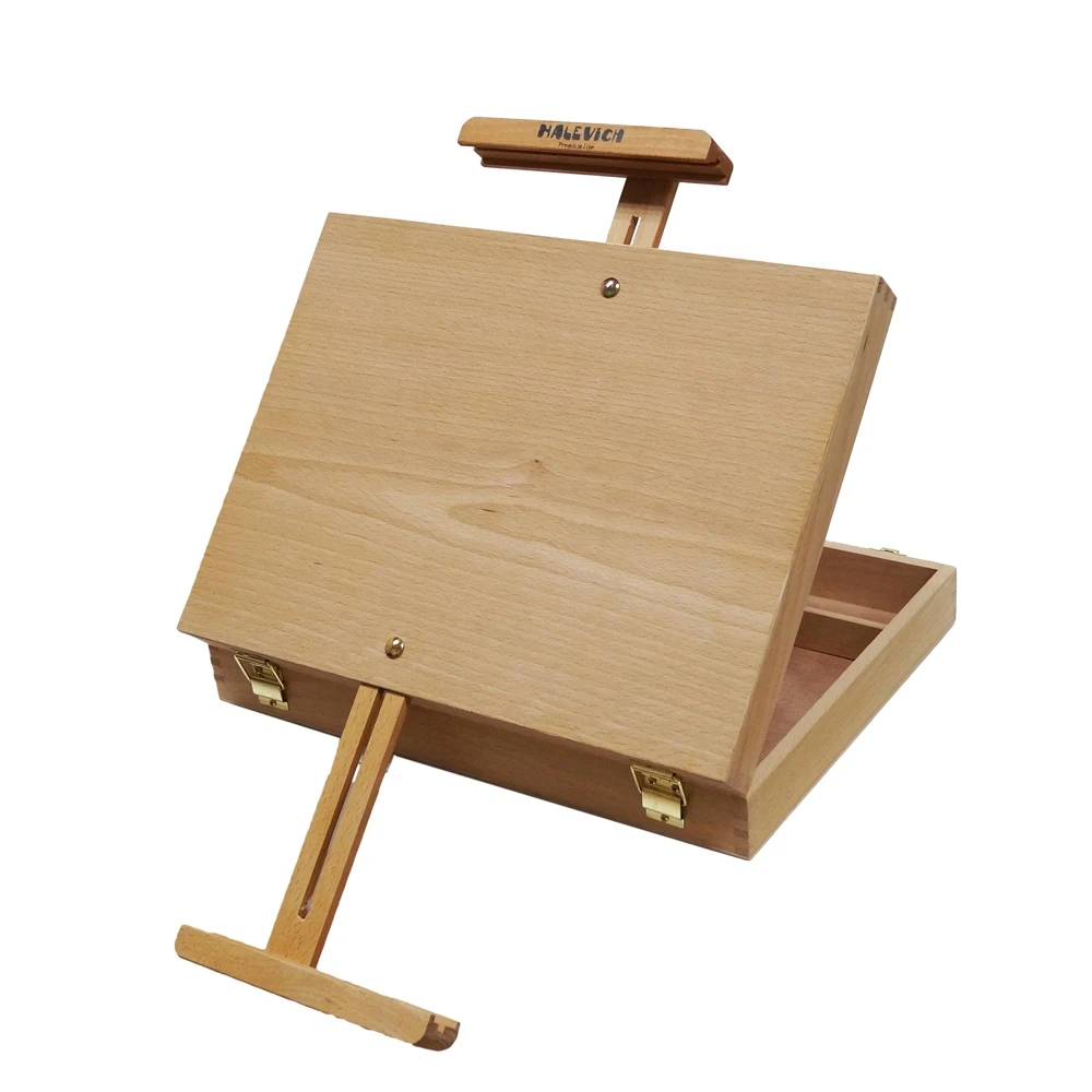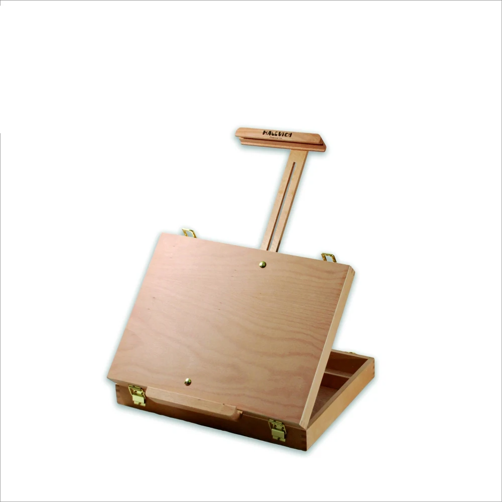 Настольный мольберт из бука с ящиком интересной конструкции. Помимо регулировки верхнего зажима для холста, также регулируется нижняя планка, ее можно опустить вниз, в результате чего очень удобно работать поставив мольберт на край стола. При этом можно работать даже на больших холстах, что невозможно на других моделях настольных мольбертов. В ящик мольберта можно положить принадлежности для живописи. Имеет ручку из кож. зама для удобной переноски.