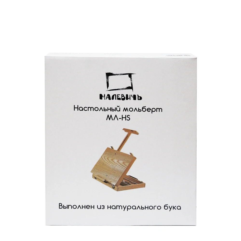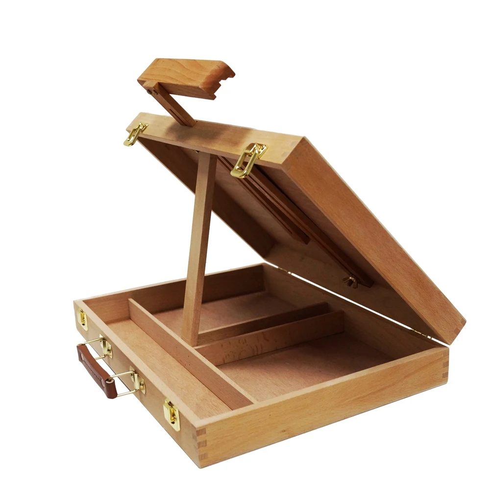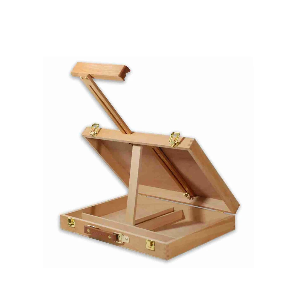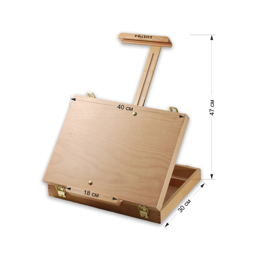 Настольный мольберт из бука с ящиком интересной конструкции. Помимо регулировки верхнего зажима для холста, также регулируется нижняя планка, ее можно опустить вниз, в результате чего очень удобно работать поставив мольберт на край стола. При этом можно работать даже на больших холстах, что невозможно на других моделях настольных мольбертов. В ящик мольберта можно положить принадлежности для живописи. Имеет ручку из кож. зама для удобной переноски.