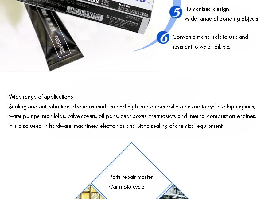 Герметизация и антивибрация всех видов автомобилей высокого класса, тяжелых транспортных средств, автомобилей, судовых двигателей, насосов, коллекторов, насадок, масляных поддонов, коробок передач, термостатов и двигателей внутреннего сгорания, но также для механического, электронного и химического оборудования статического уплотнения