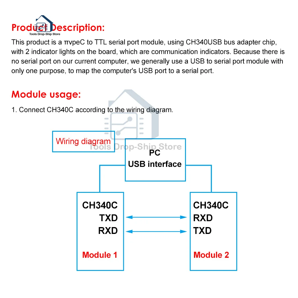 This product is a Type-C to TTL serial port module, using CH340 USB bus conversion chip, with 2 indicator lights on the board, which are communication indicators. Because there is no serial port on our current computer, we generally use a USB to serial port module, with only one purpose, to map the computer's USB port to a serial port.
