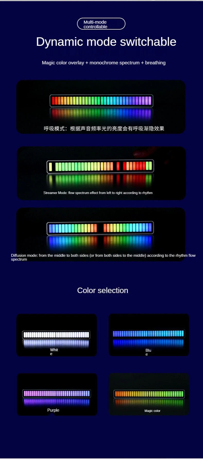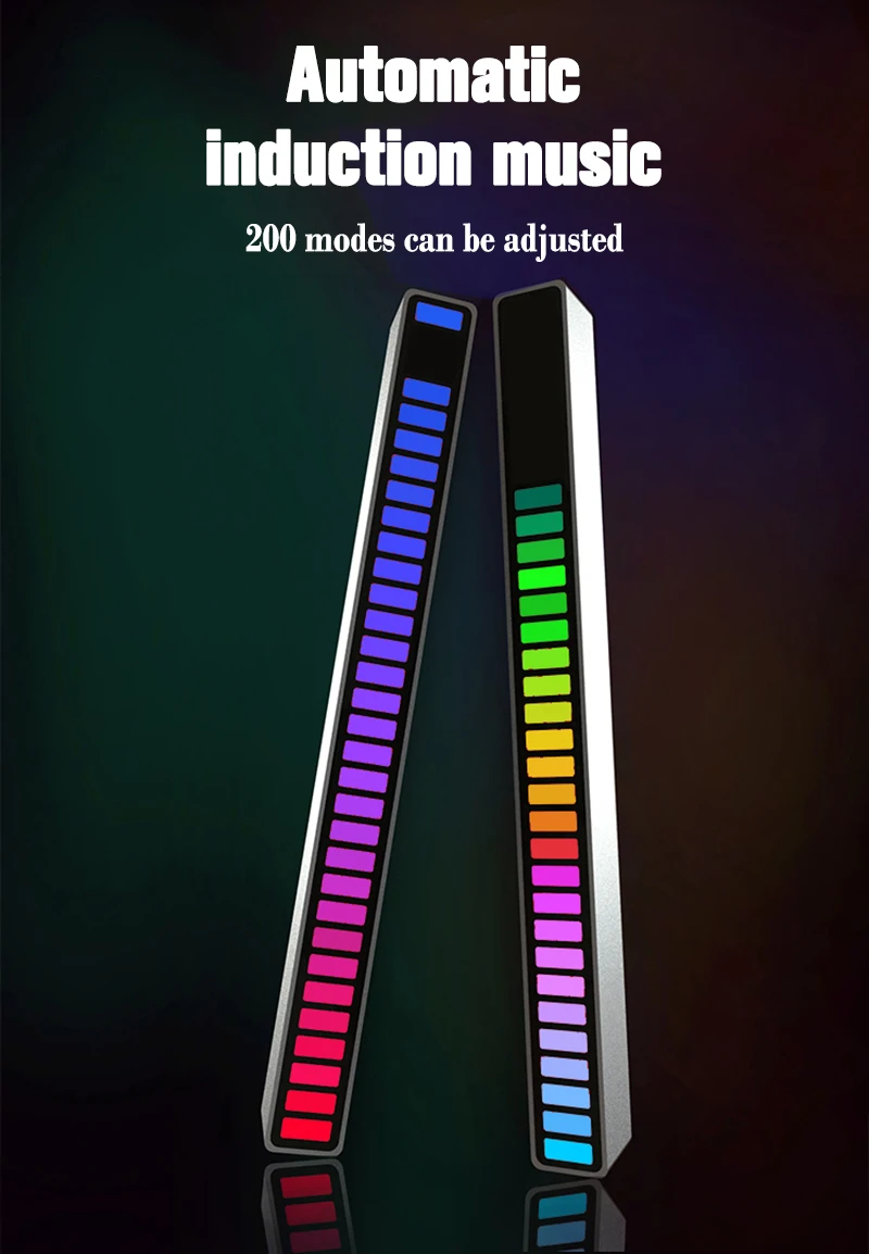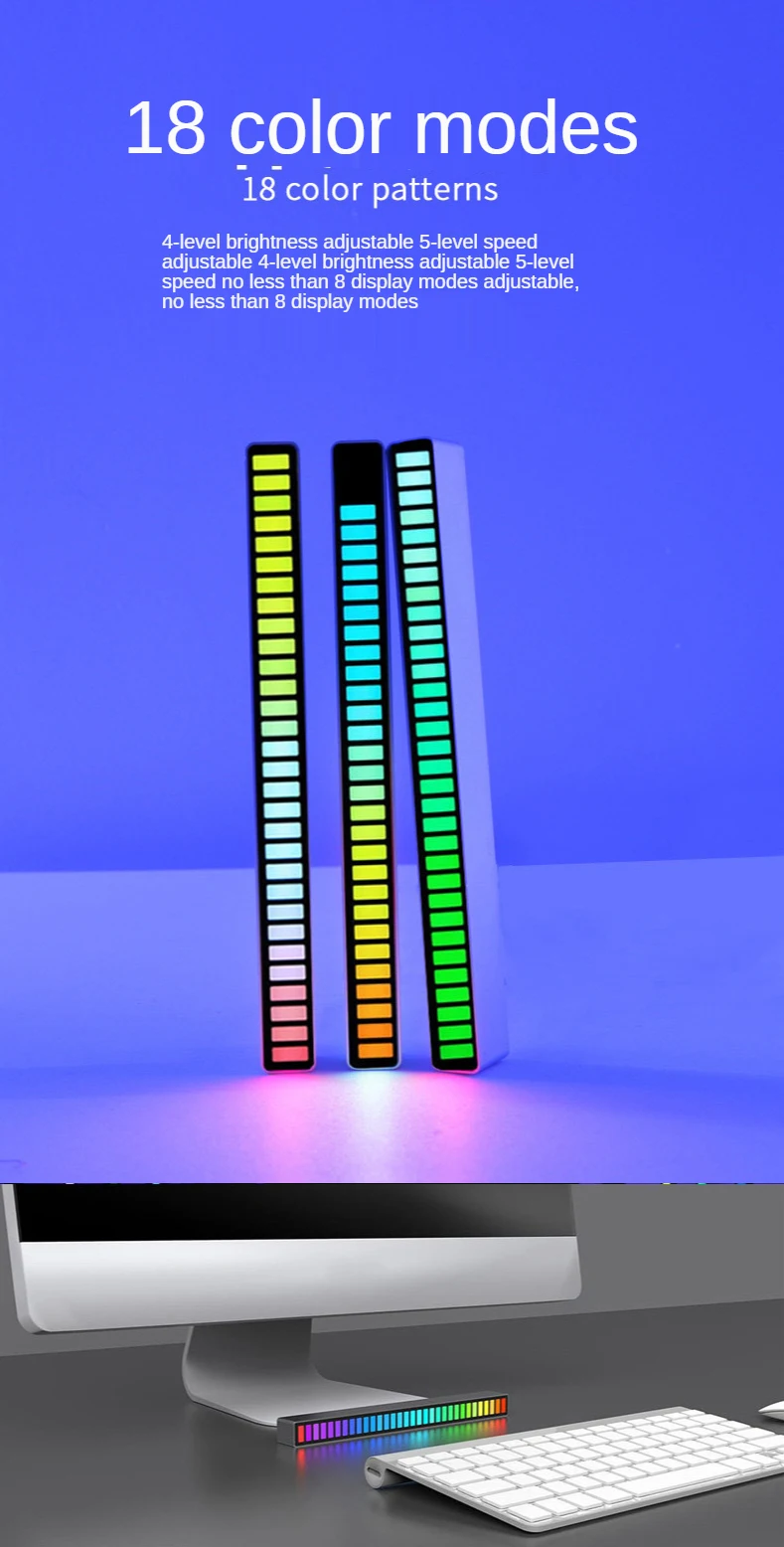 4. Типы обновления: индукция звукового поля, источник питания USB (Type _ c), может фильтровать шумовую среду, мобильный телефон управление через приложение: 7 видов статической модели, пять видов динамических моделей, 10 видов рисунков звукоснимателя.