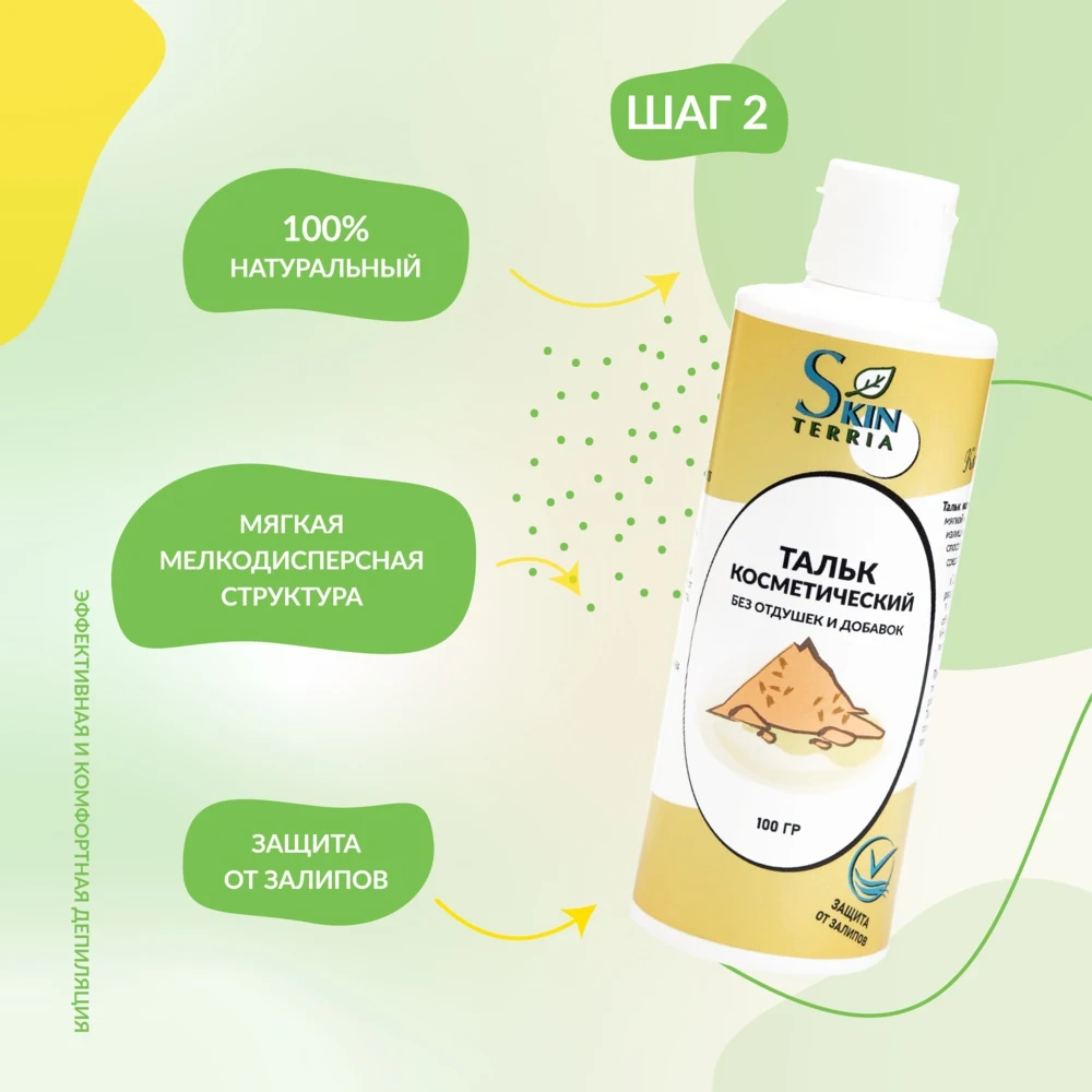 Бережное очищение и защита кожи Набор для восковой депиляции и шугаринга SKINTERRIA поможет Вам провести салонную процедуру в домашних условиях быстро и эффективно. Лосьон перед депиляцией SKINTERRIA Бережно очищает и обезжиривает кожу, подготавливая ее к процедуре депиляции. Состав: вода, хлоргексидин биглюконат, д-пантенол, экстракт мяты, экстракт алоэ вера, антиоксиданты Тальк косметический SKINTERRIA Быстро впитывает излишки влаги и обезжиривает кожу, что способствует более эффективной работе сахарной пасты и воска для депиляции.