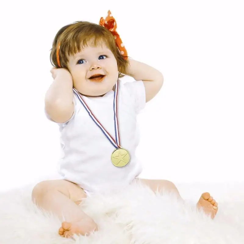 Материал/Размеры из дети медали: Изготовлен из легкого пластика, с лакокрасочным покрытием цвет золотистый, меры 3,8 см/1,5 дюйма в диаметре, 33 см/12,99 inch лента длиной с красным, белый и синий цвета, хорошая длина, которая позволяет легко приспосабливаться к головам детей, а награды и медали блестят, как настоящее золото