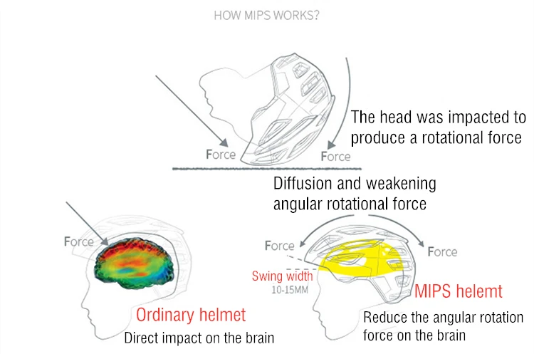 MIPS mimics the brain's protective mechanism. The brain is surrounded by a cushioning cerebrospinal fluid that absorbs gravity to protect the head when it is shocked. MIPS replicates this technology very well.When an impact occurs, the MIPS floating seismic layer buffers impact forces from different directions and angles.Reduce the shock intensity of the brain and avoid more serious damage caused by spinal torsion.