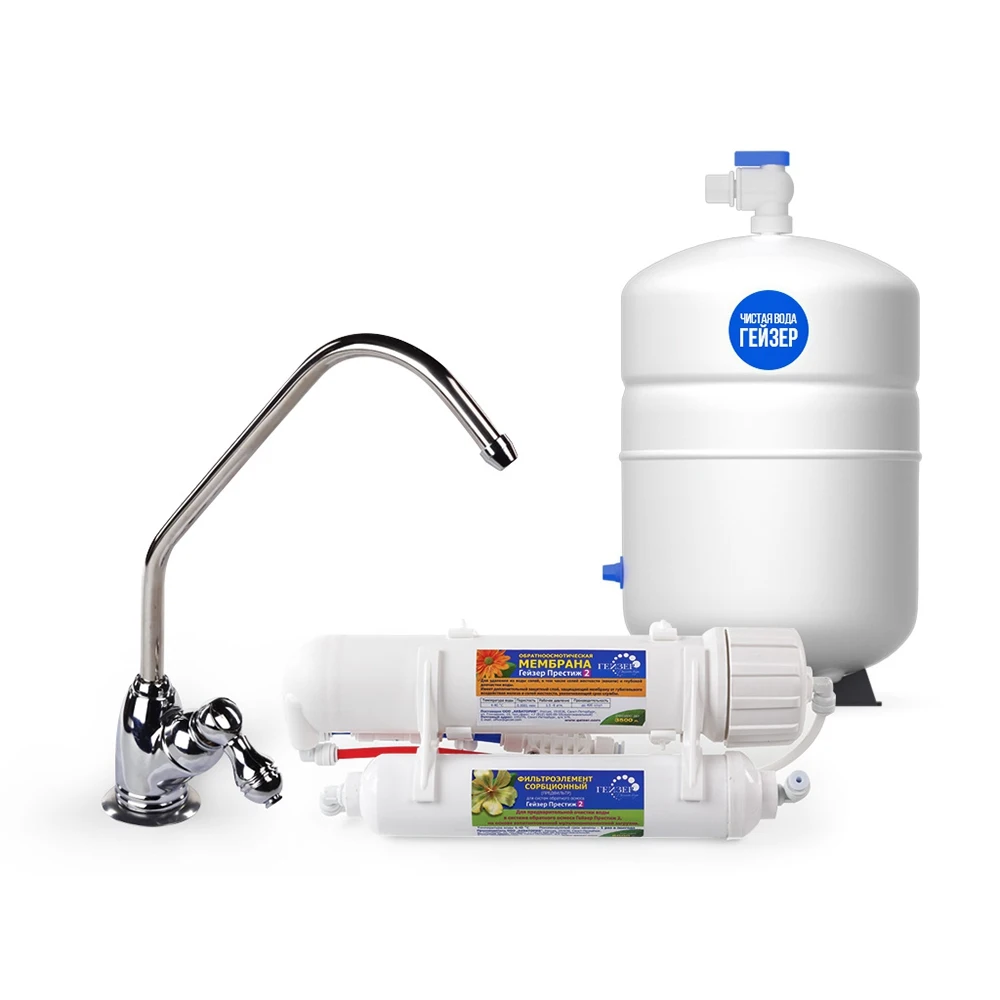 Технология обратного осмоса в фильтре Гейзер Престиж 2, заключается в фильтровании воды через полупроницаемую мембрану. Размеры пор мембраны настолько малы, что пропускают только молекулы воды. Размер молекул большинства примесей, а также бактерий и вирусов значительно больше молекул воды, поэтому они не проходят через мембрану. Специально разработанный блок предоочистки позволяет очищать воду с высоким содержанием солей жесткости и растворенного железа.