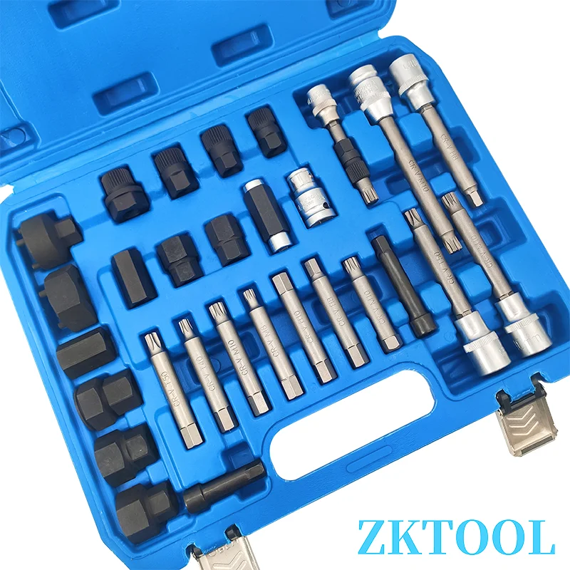 Набор из 30 штук содержит набор специальных головок для разрезания шпагатов и звездочек для демонтажа шкива привода маховика генератора. Пожалуйста, посмотрите изображение слева для конкретных параметров модели.