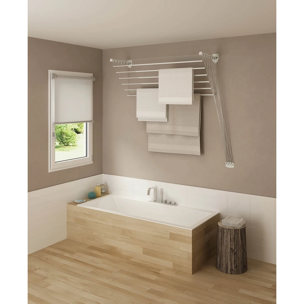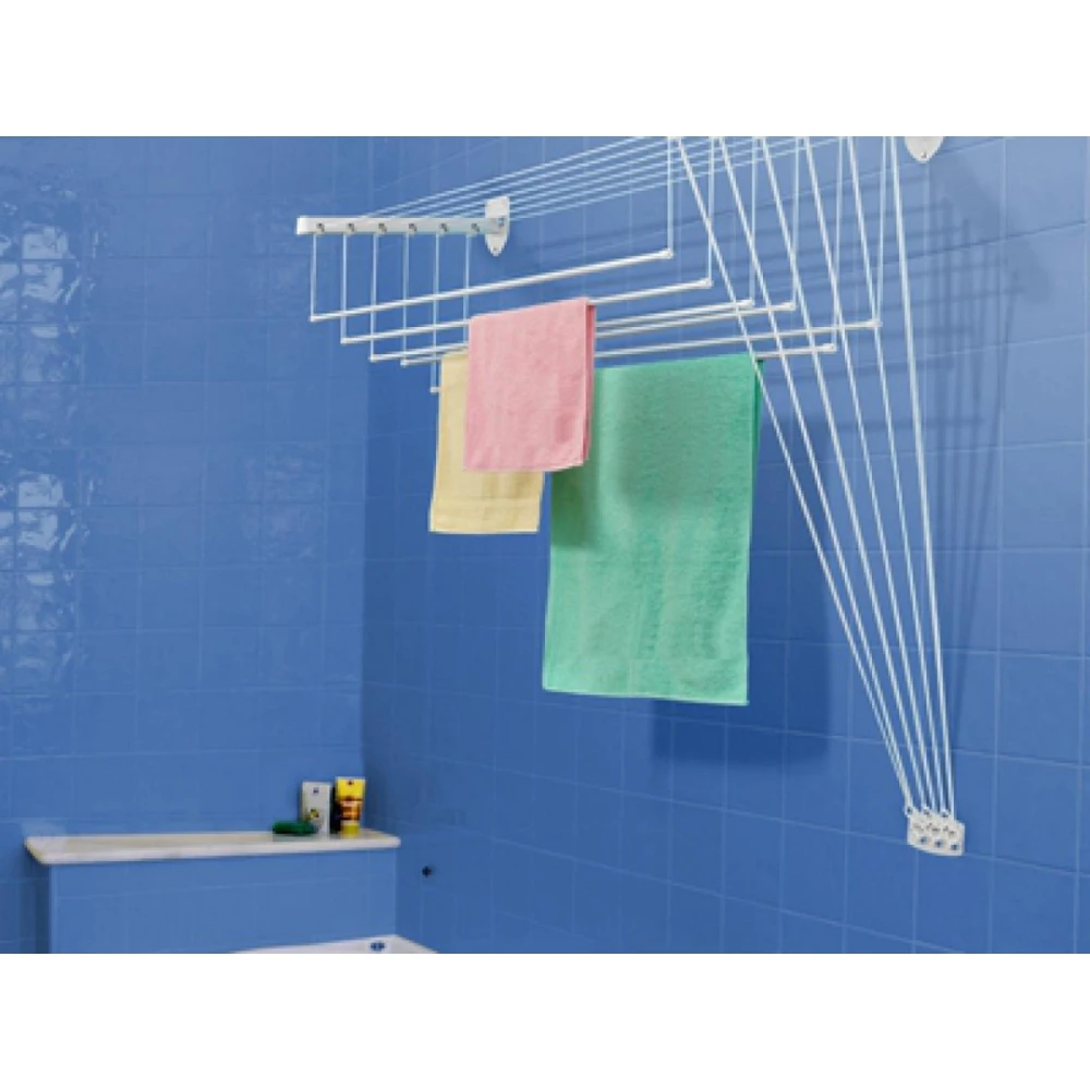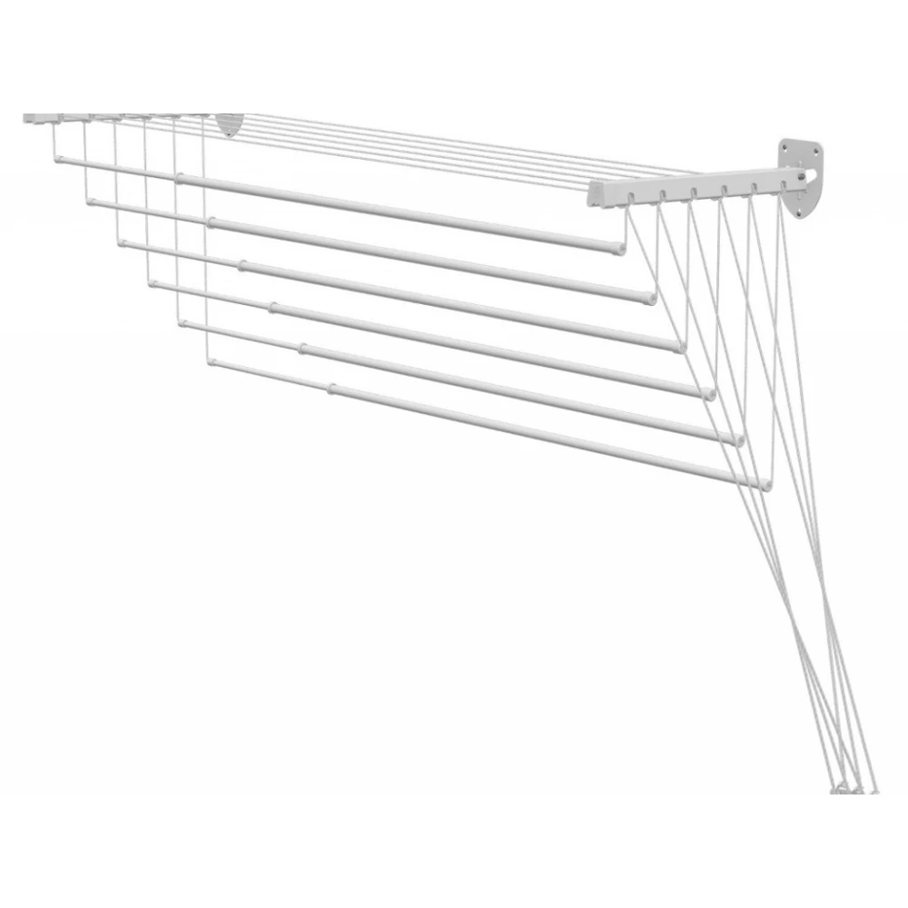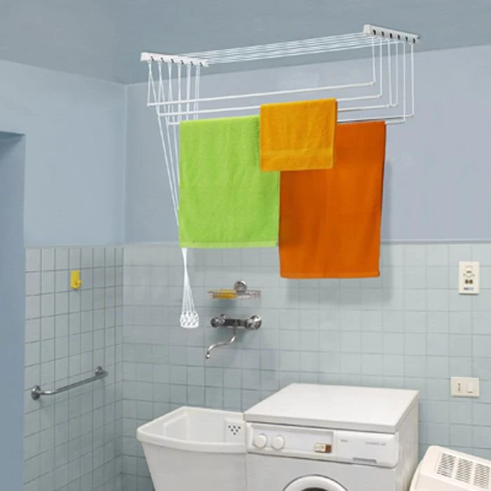 Сушилка Gimi "Lift 160" представляет собой пластиковые стержни, закрепленные при помощи направляющих шнуров на стальных кронштейнах, которые в свою очередь крепятся на стене или потолке. Специальный механизм обеспечивает подъем и опускание стержней, что значительно облегчает процесс развешивания белья. Стержни сушилки, на которые развешивается белье, устанавливаются до нужного для вас уровня, в зависимости от вашего роста.