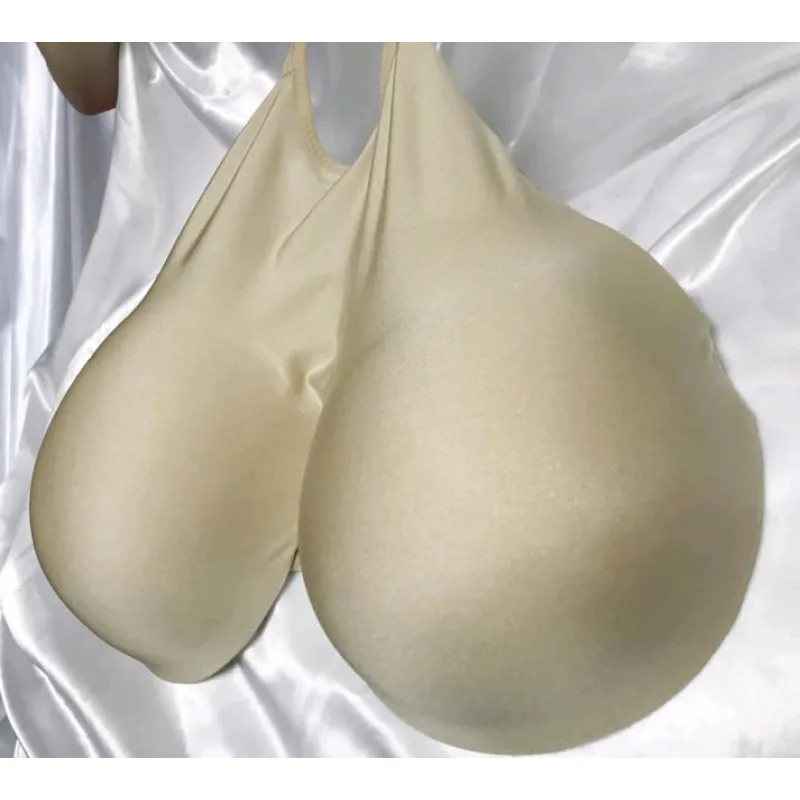 Накладная грудь сшита под горло. На поверхности гладкая ткань телесного цвета. Поэтому для маскировки перехода от ткани к телу Вы можете воспользоваться одеждой и платочком либо колье на шею.