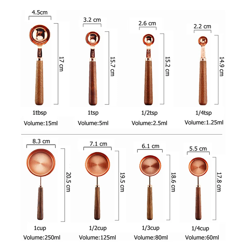 Мерная Ложка и чашка с медным покрытием из нержавеющей стали прочны и долговечны. Ручка выгравирована метками для чтения, рукоятка из ореха может быть идеально захватана.
