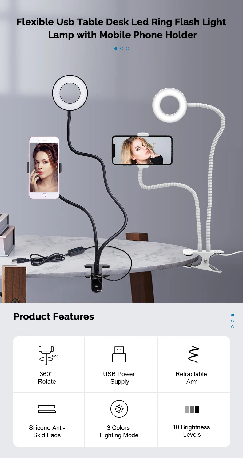 1. Гибкий и регулируемый держатель: вращающийся на 360 градусов держатель для телефона, просто не стесняйтесь отрегулировать любой угол, который вам нравится, для удобного просмотра, фотографирования или съемки видео.