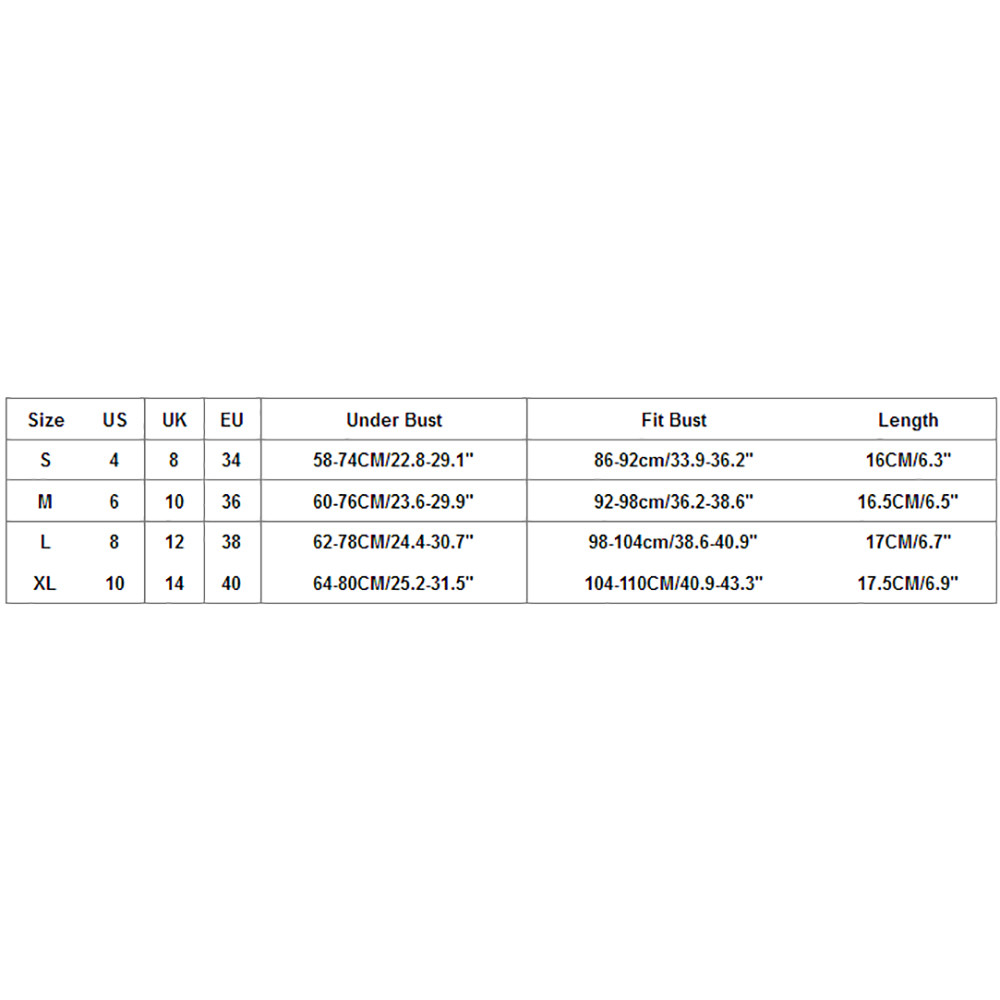 | Размеры | США | Великобритания | ЕС | Под грудью | Подходит для бюста | Длина |