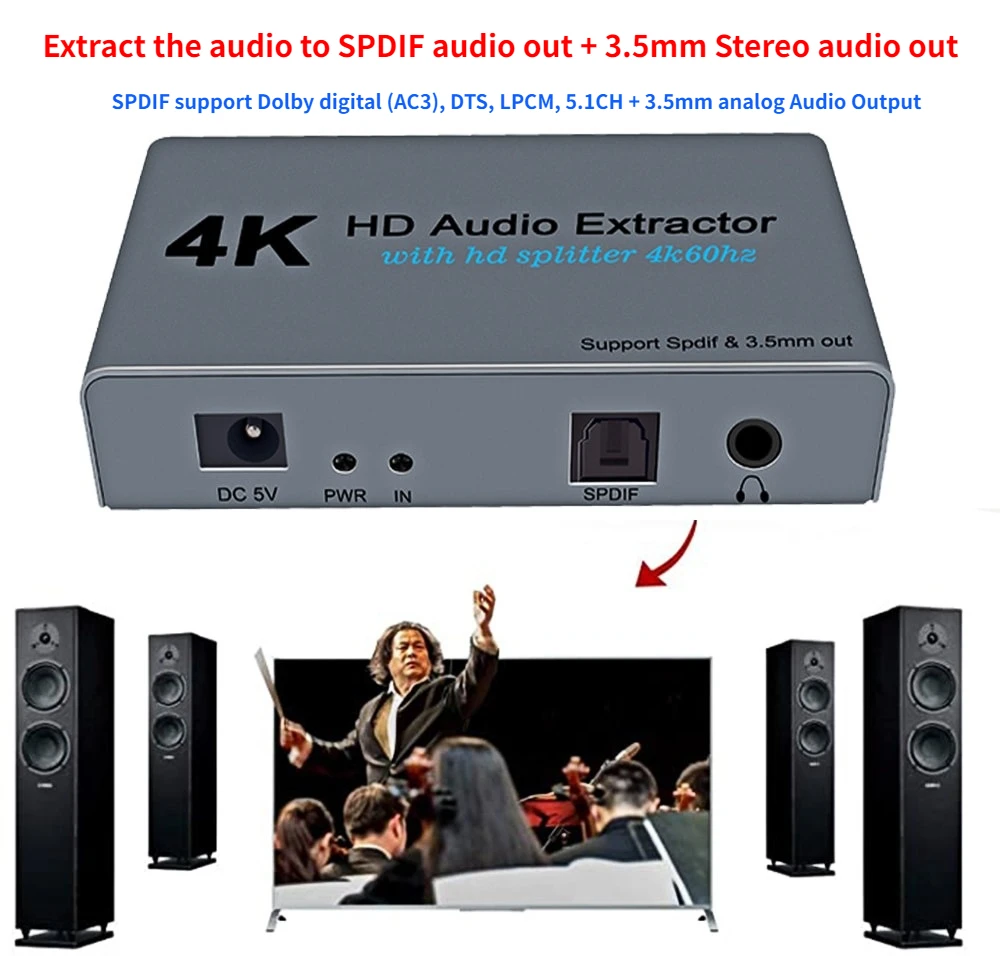 ОписаниеЭтот новый HDMI аудио экстрактор может поддерживать 3D \ 4KX2K и он позволяет 1 HDMI вход и 2 HDMI выход подключен к 1 HD дисплей (как телевизор или проектор) И извлеките аудио в SPDIF audio out + 3,5 мм Stereo audio out. Не только для того, чтобы соответствовать идеальному изображению HDTV, но и для удовлетворения потребностей энтузиастов в аудио.Наши устройства предлагают решения для шума, пространства и безопасности, управления центром обработки данных, распространения информации, презентаций конференц-зала, школы и корпоративных условий обучения.Аудио экстрактор HDMI-HDMIИзвлеките аудио в SPDIF audio out + 3,5 мм Stereo audio out.Поддержка цифрового аудио формата SPDIF: Dolby digital (AC3), DTS, LPCM и поддержка 5.1CH.Поддержка 3,5 мм аналоговый аудио Выход.1 в 2 OUT 4K 60HZ HDMI сплиттерHDMI аудио экстрактор может поддерживать 3D \ 4KX2K и он позволяет 1 HDMI вход и 2 HDMI выход, подключенный к 1 HD дисплею.Технические характеристикиРазрешение HDMI: 24/50/60fs/1080p/1080i/720p/576p/576i/480p/480iПоддержка цветового формата видео: 24 бит/30 Бит глубокого цвета, 36 битАудио выход: 3,5 мм + SPDIFМаксимальная пропускная способность: 300 МГцМаксимальная скорость передачи данных: 9,0 Гбит/сВходной/Выходной сигнал TMDS: 0,5 ~ 1,5 Вольт p-p(TTL)Вход/выход DDC сигнал: 5 вольт p-p (TTL)Расстояние входного кабеля: ≤ 15 м AWG26 HDMI Стандартный кабельРасстояние выходного кабеля: ≤ 20 м AWG26 HDMI Стандартный кабельМаксимальный рабочий ток: 500 мАВходная мощность формата: 5 В постоянного токаДиапазон рабочих температур: (от-10 до + 55 ℃)Диапазон температур хранения: от-20 до + 60 ℃Диапазон рабочей влажности: от 10 до 90% относительной влажности (без конденсации)Диапазон влажности хранения: от 5 до 95% относительной влажности (без конденсации)Светодиодный индикатор: когда источник или раковина работают, светодиодный светильник.Посылка включает в себя1*4k Аудио экстрактор1 * Адаптер питания1 * Руководство пользователя![]()