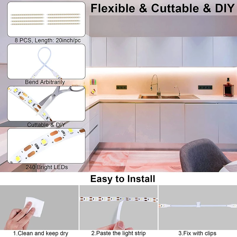 Гибкая конструкция: usb-портом совместимым, вы можете использовать адаптер питания или usb-интерфейс для источника питания, 8 светильник полоски (20 inch/pc) с соединительных проводов (5,9 inch/pc) предназначены для того, чтобы сгибать и сворачивать вокруг углов. И вы можете свободно настроить длину и разрезать на конце полосы-светильник.