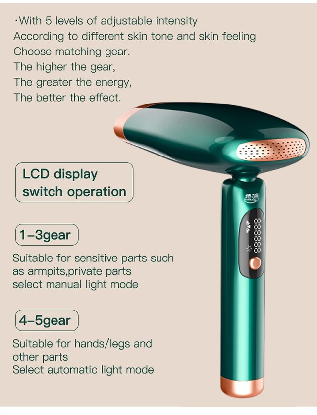 5 уровней разных светильник интенсивности, подходит для разных цветов из кожи и безопасная для кожи ткань высокого качества, и внимательное отношение различных кожи окружающей среды и потребности.
