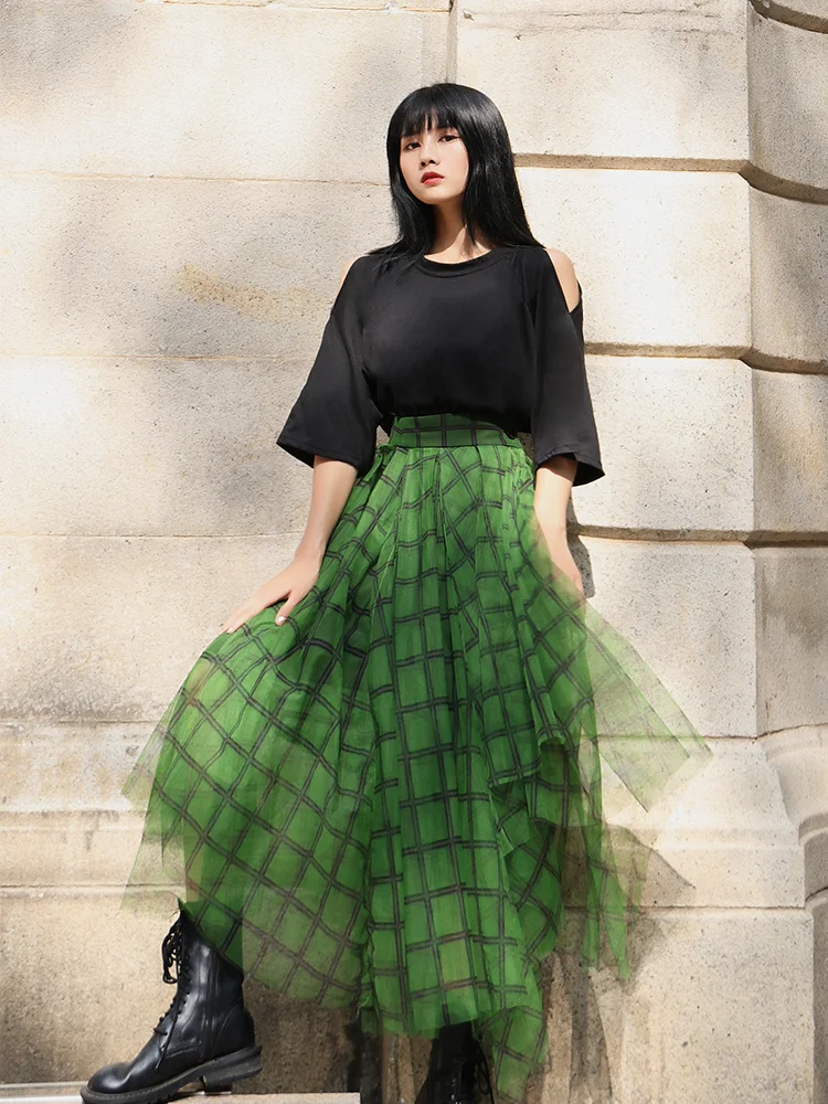 Женская трехслойная плиссированная юбка миди TIGENA зеленая длинная