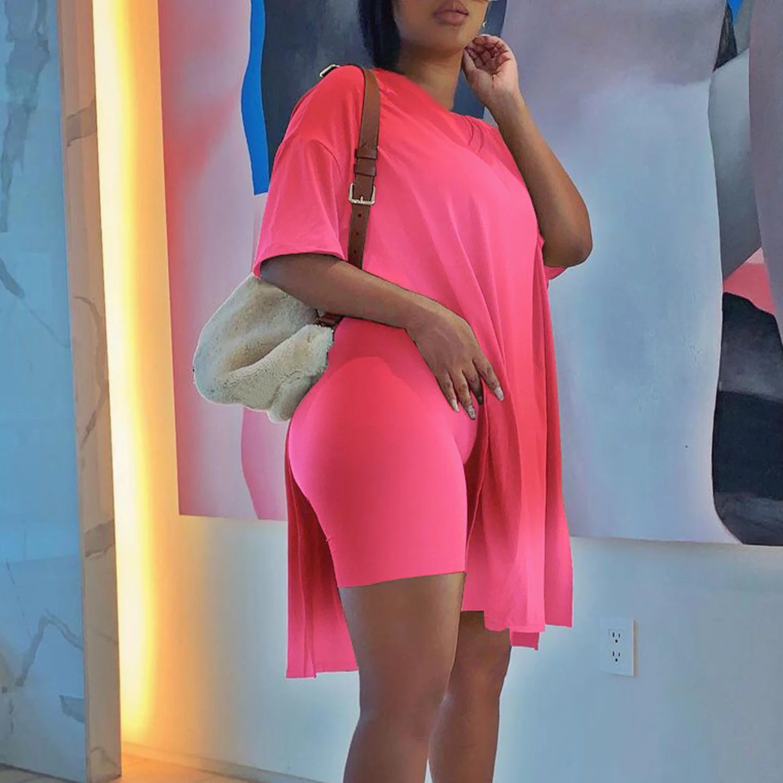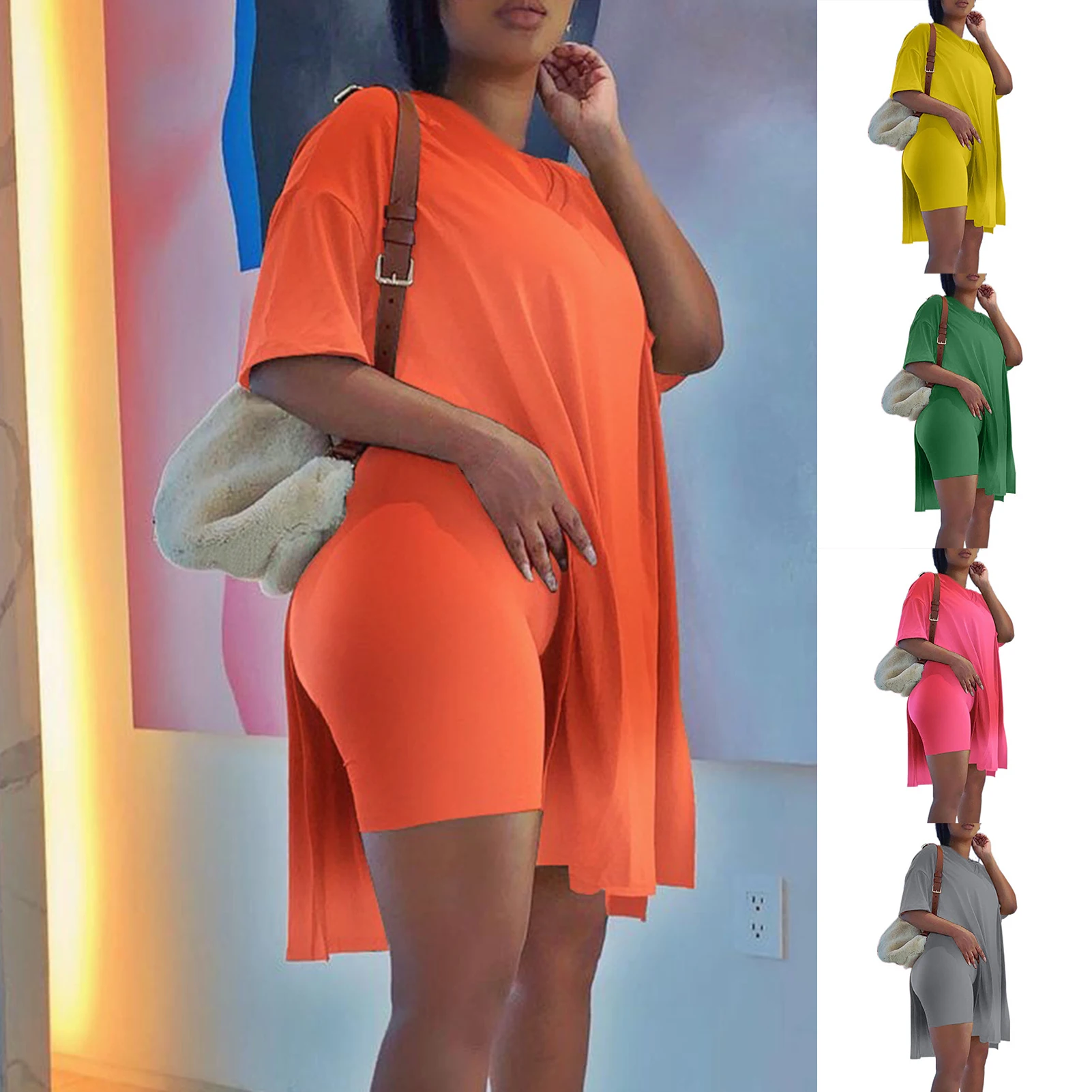 Лидер продаж, Модный повседневный свободный Однотонный женский наряд с коротким рукавом, комплект из двух предметов, туника, топ, облегающие шорты, для отдыха размера плюс