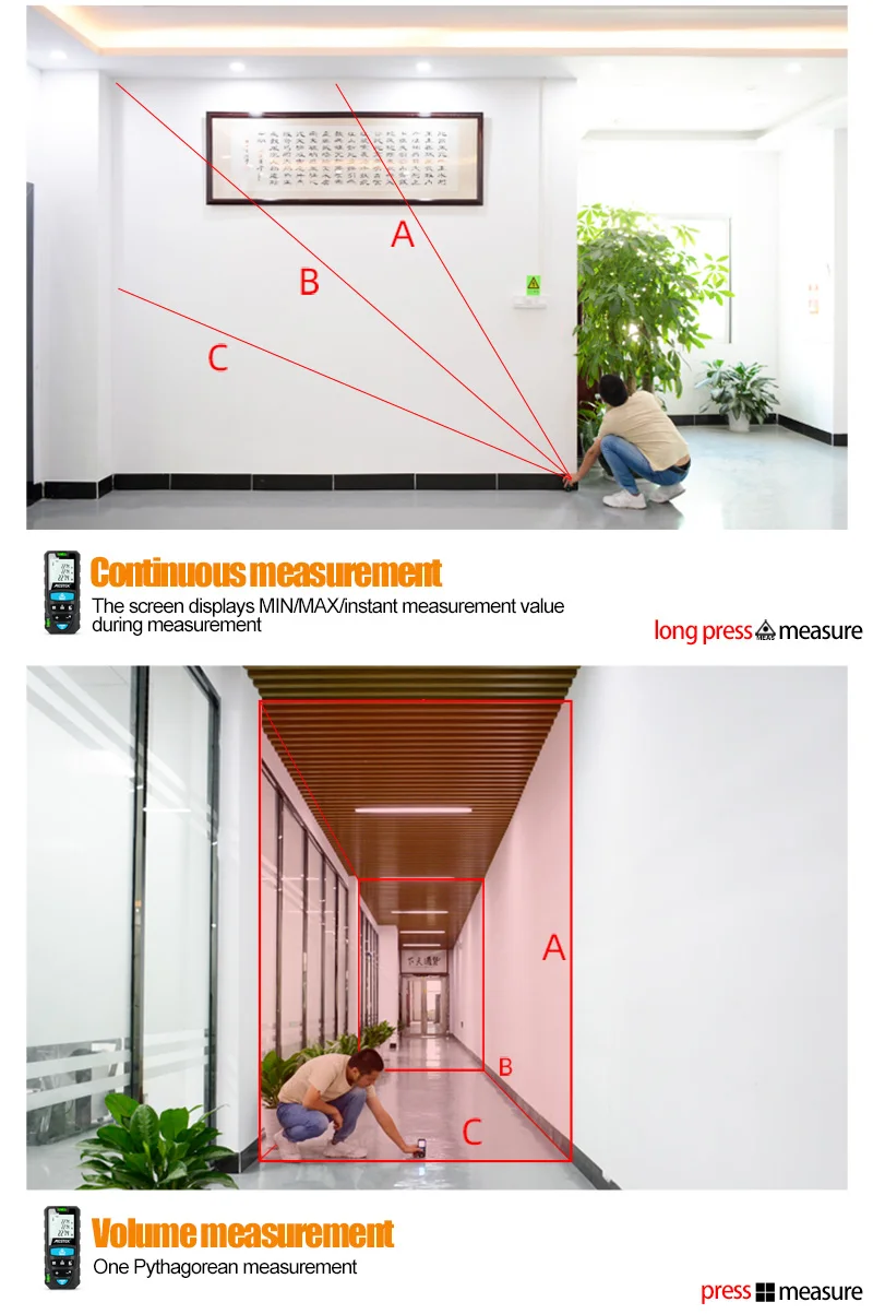 Максимальный диапазон измерения: 50 м 70 м 100 м точность измерений: +-2 мм единицы измерения: m/ft/in/ft + Класс лазера: класс 2 область, измерение vlume: да Непрямая теорема пифаора: Да сложение и вычитание: Да непрерывное измерение: да мин/Макс. Значение: Да звуковой сигнал: Да 4-строчный дисплей с подсветкой: Да однократное измерение расстояния: Да Historcal памяти: в общей сложности 20 блоков кнопки: мягкая резина кнопки Рабочая температура: 0C ~ 60C Батарея срок службы: 5000 раз измерения Battrey Тип: AAA 2x1,5 V автоматический лазер ВЫКЛ: 30 секунд автоматический инструмент ВЫКЛ: 180 секунд Размеры (мм):120*48*27 Вес: 120 г