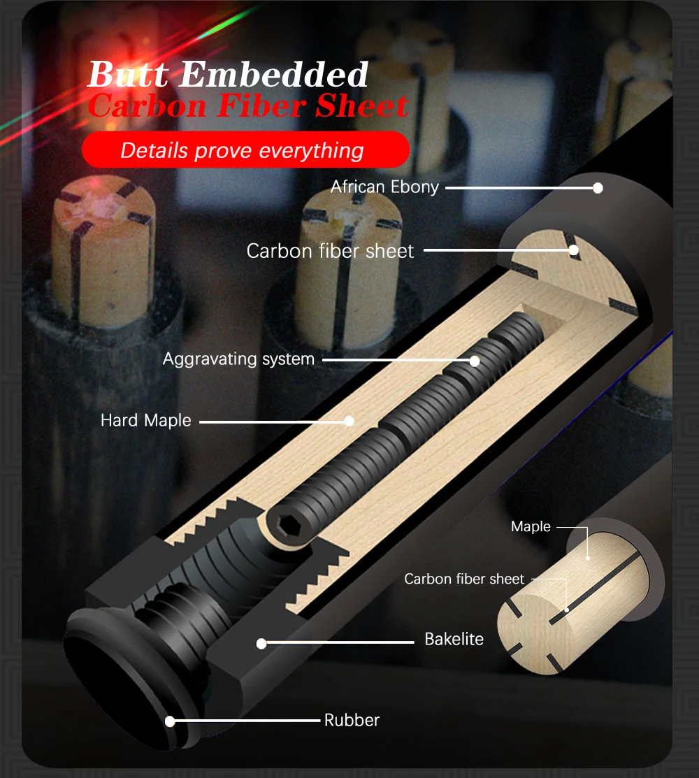 5. В основе черной технологии используется аэрокосмический чистый углеродный волокнистый композитный материал, внешний вид-углеродный черный, полая структура делает вал легче, но углеродное волокно может быть более мощным, чем твердое дерево cue