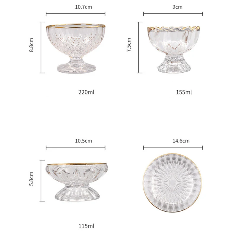 Информация о товаре:Товар: стеклянный светильник, роскошная чашка для мороженогоМатериал: стеклоЦвет: как на фотоРазмеры: 10,7x8,8 см 220 мл/9x7,5 см 155 мл/10,5x5,8 см 115 мл/Dia 14,6 см