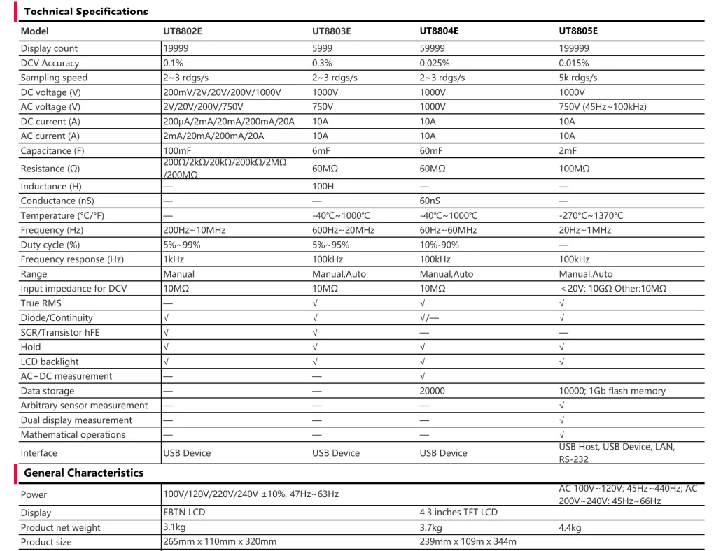Серия включает в себя четыре модели, UT8802E/03E/04E/05E, предоставляя клиентам больше возможностей для выбора, она может соответствовать любому DMM приложению со скоростью, точностью, надежностью и эффективностью, значительно превосходящей его цену.