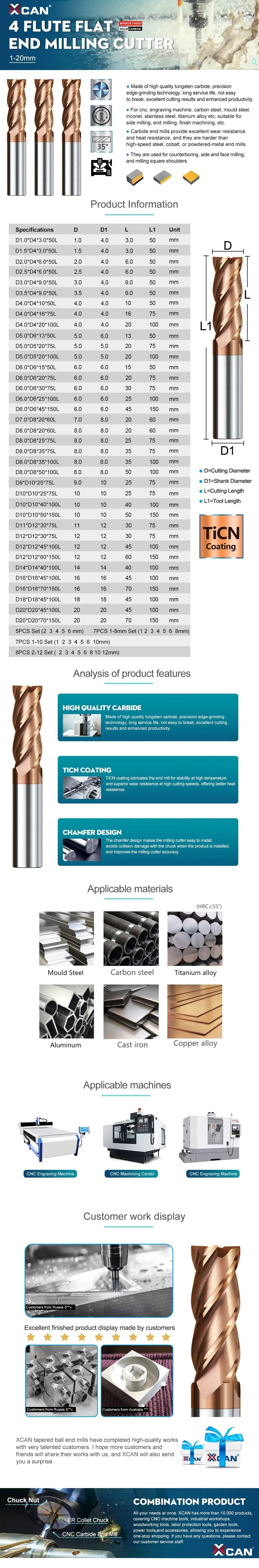 XCAN фрезерный станок с ЧПУ 4 флейта фреза с покрытием из карбида Концевая фреза 1-12 мм HRC60 фреза с ЧПУ фрезерные инструменты